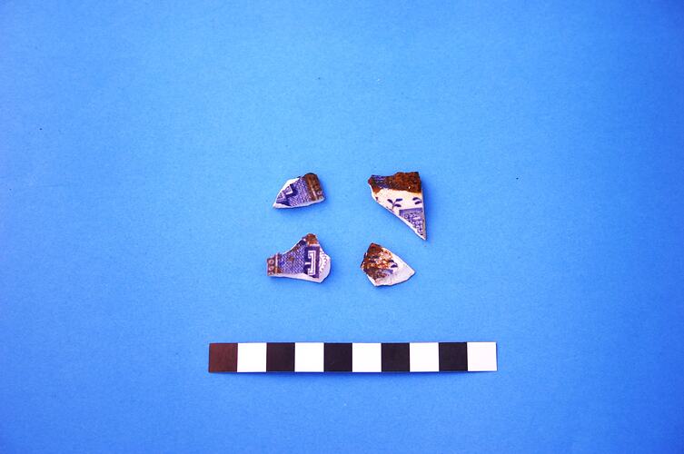 Four conjoining fragments of an earthenware plate rim. Pattern is blue transfer print 'Willow'. Manufacturing date range is circa 1805 to present.