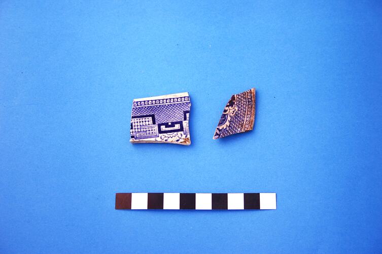 Two rim fragments of earthenware plates (2 separate items). Pattern is blue transfer print 'Willow'. Manufacturing date range is circa 1805 to circa 1900.