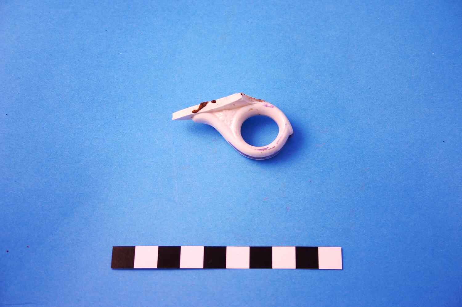 One handle and body fragment of an earthenware cup or mug. Decoration is a handpainted line of violet along the handle, but item may have also been transfer printed. Date range of manufacture circa 1805 to circa mid-20th century.