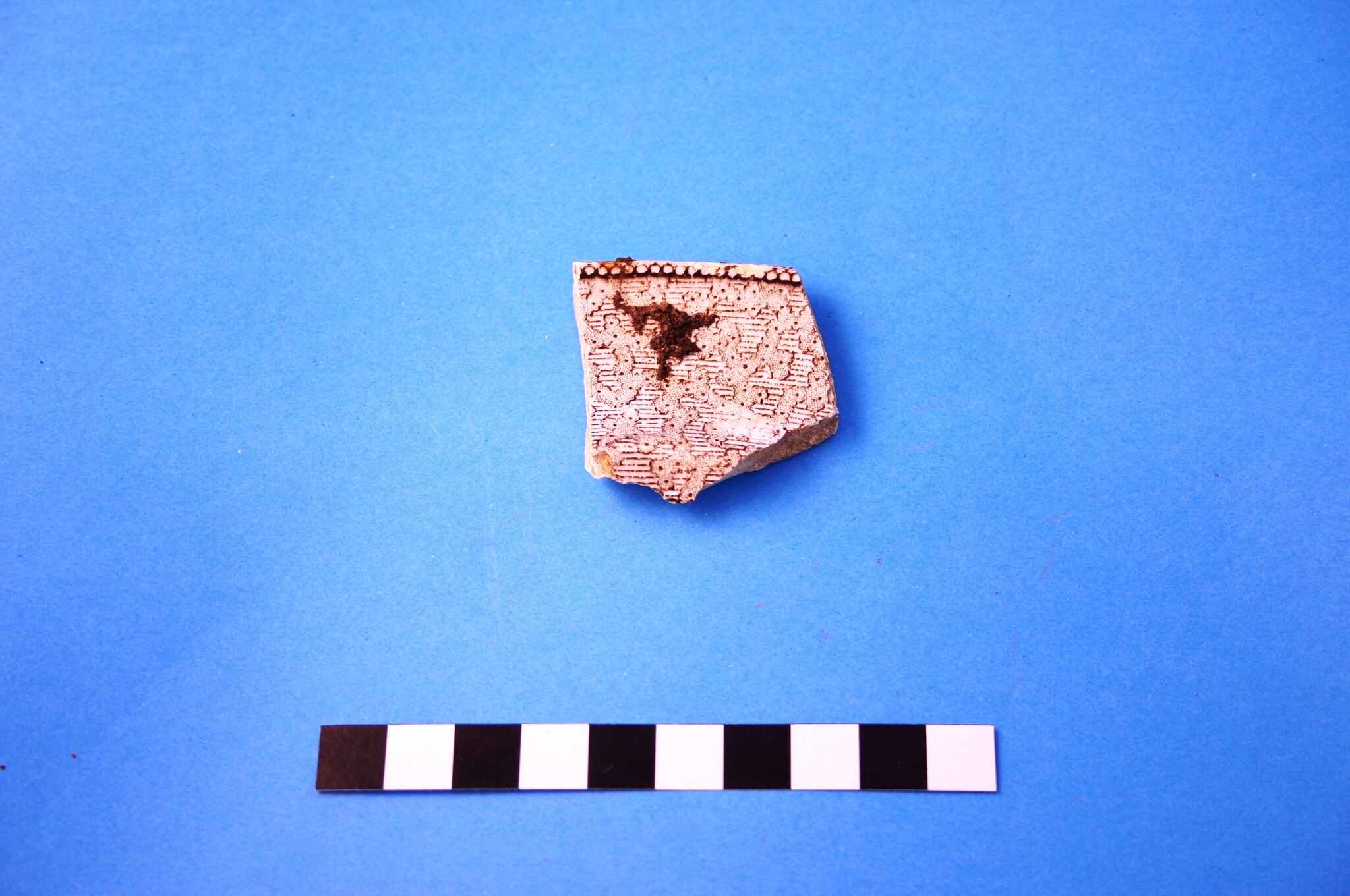 One earthenware rim fragment from a plate. Decoration is brown transfer print in an unidentified pattern. Manufacture date is circa 1816 to circa mid-20th century.