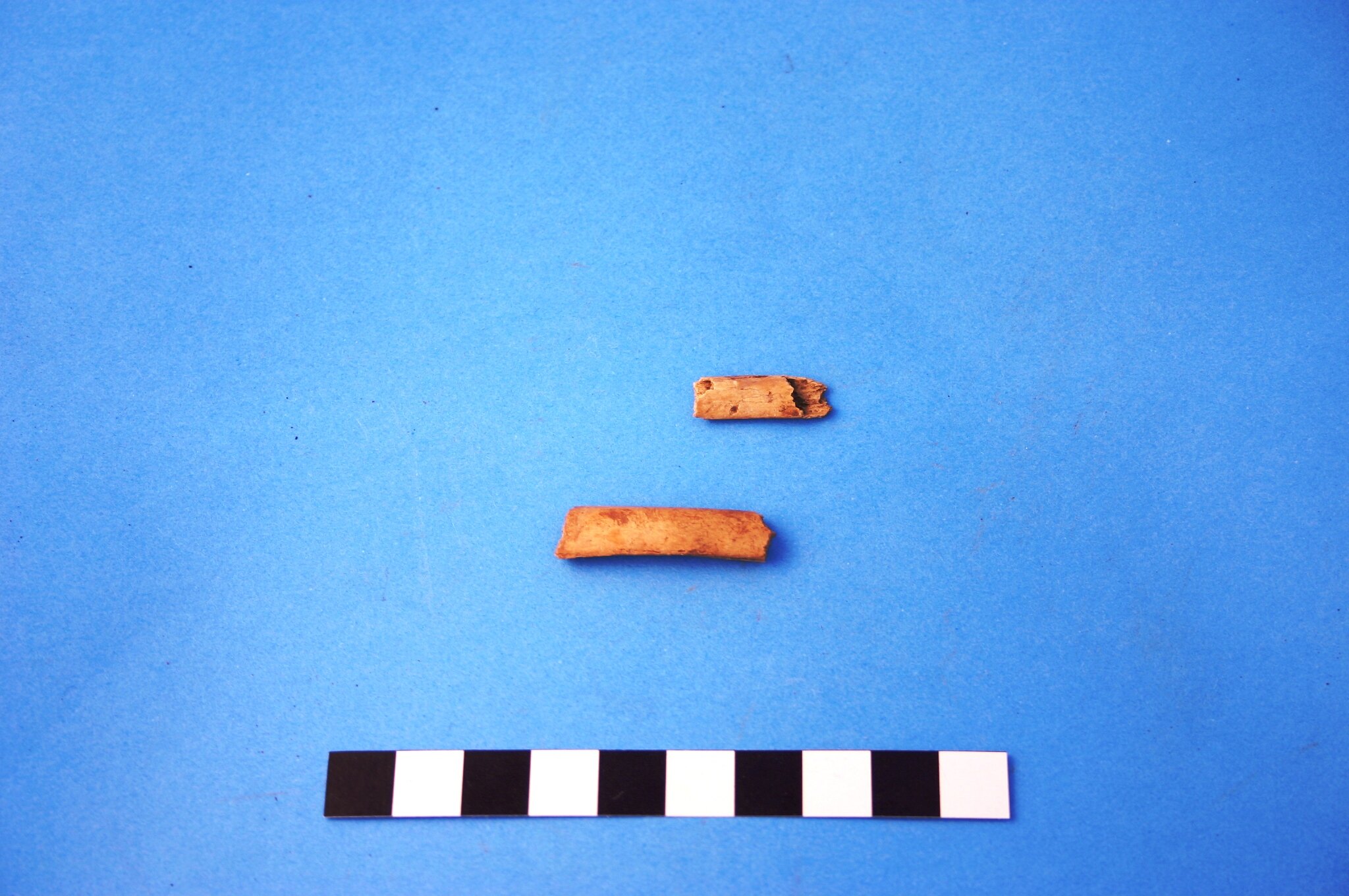 Two fragments of sheep rib bone. These fragments are from different bones.