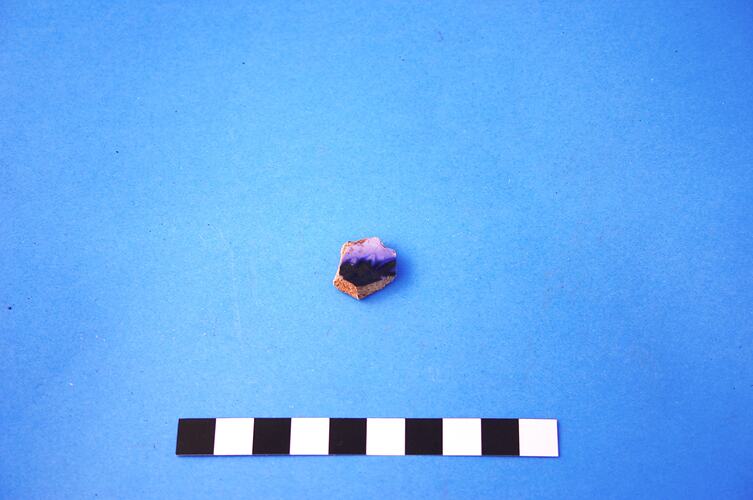 One earthenware fragment from an unidentified item. Has a moulded design (probably leaves and flowers) and is blue flow ware. Manufacture date after circa 1835.