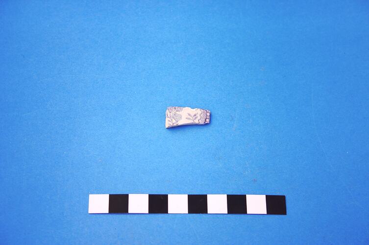 One base fragment of an earthenware plate. Transfer print is blue/grey 'Asiatic Pheasants', popular in the second half of the 19th century and into Edwardian times.