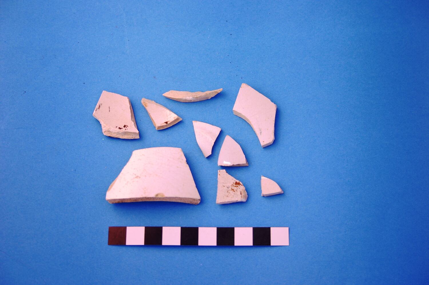 Nine fragments of white glazed earthenware from unidentified items. Manufactured after circa 1805.