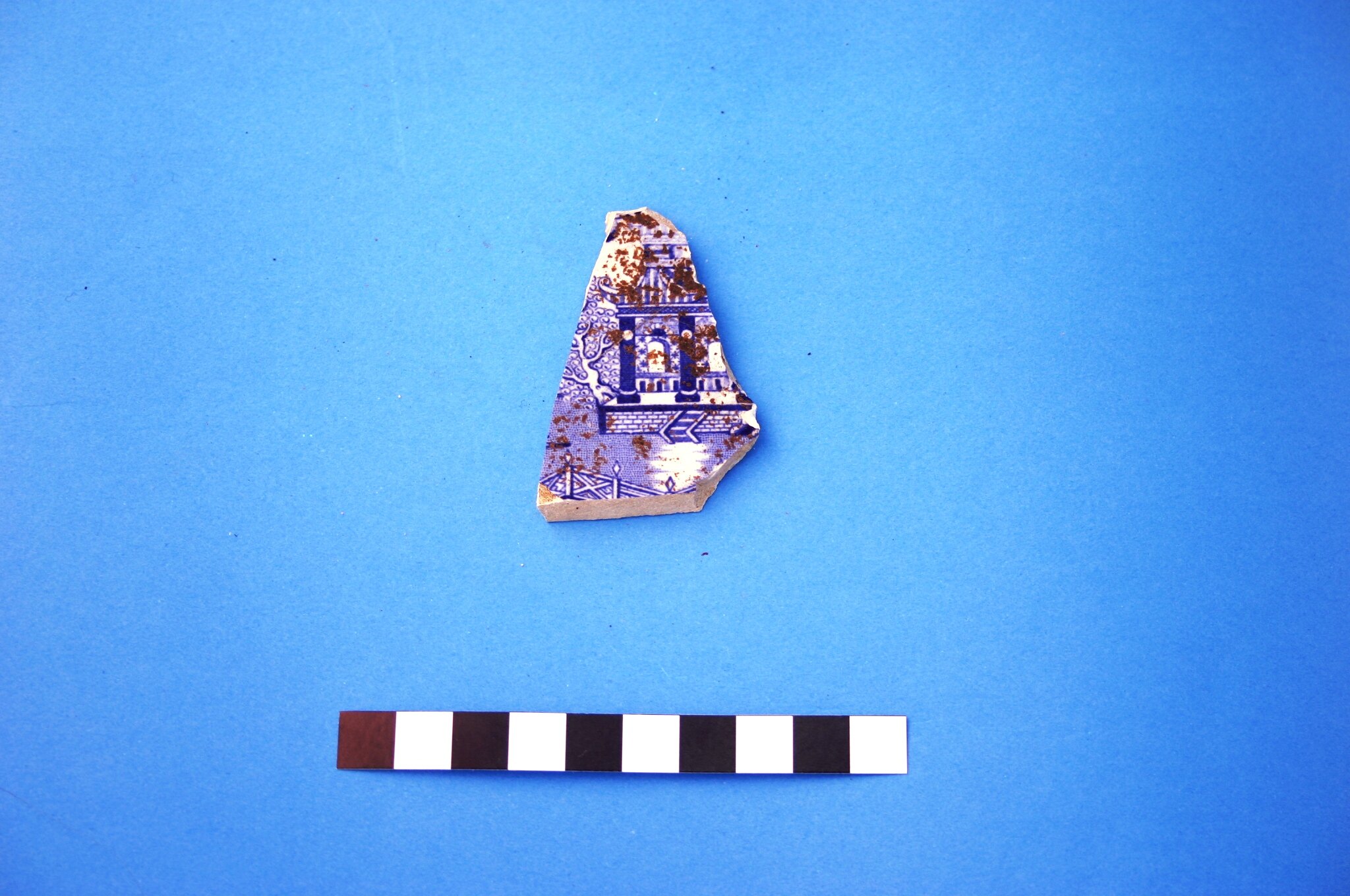 One earthenware fragment from the base of a plate. Pattern is blue transfer print 'Willow'. Manufacturing date range is circa 1805 to circa 1900.