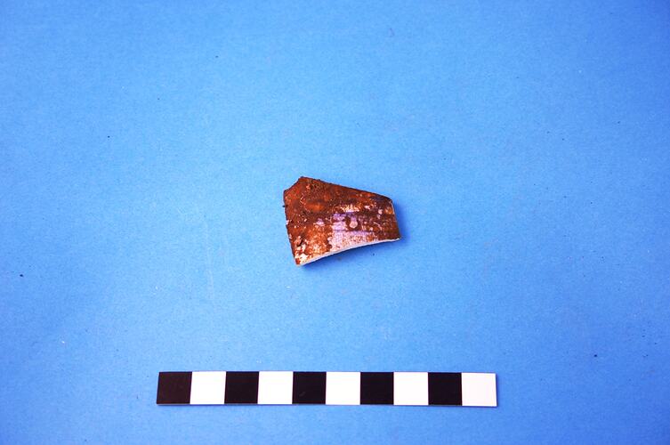 One earthenware fragment from an unidentified item (possibly a cup or mug). Decoration is violet transfer print in an unidentified pattern. Manufacture date is circa 1814 to circa 1900.