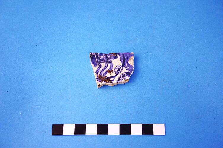 One earthenware fragment from the base of plate with a small portion of an unidentified maker's mark. Pattern is blue transfer print 'Willow'. Manufacturing date range is circa 1805 to circa 1900.