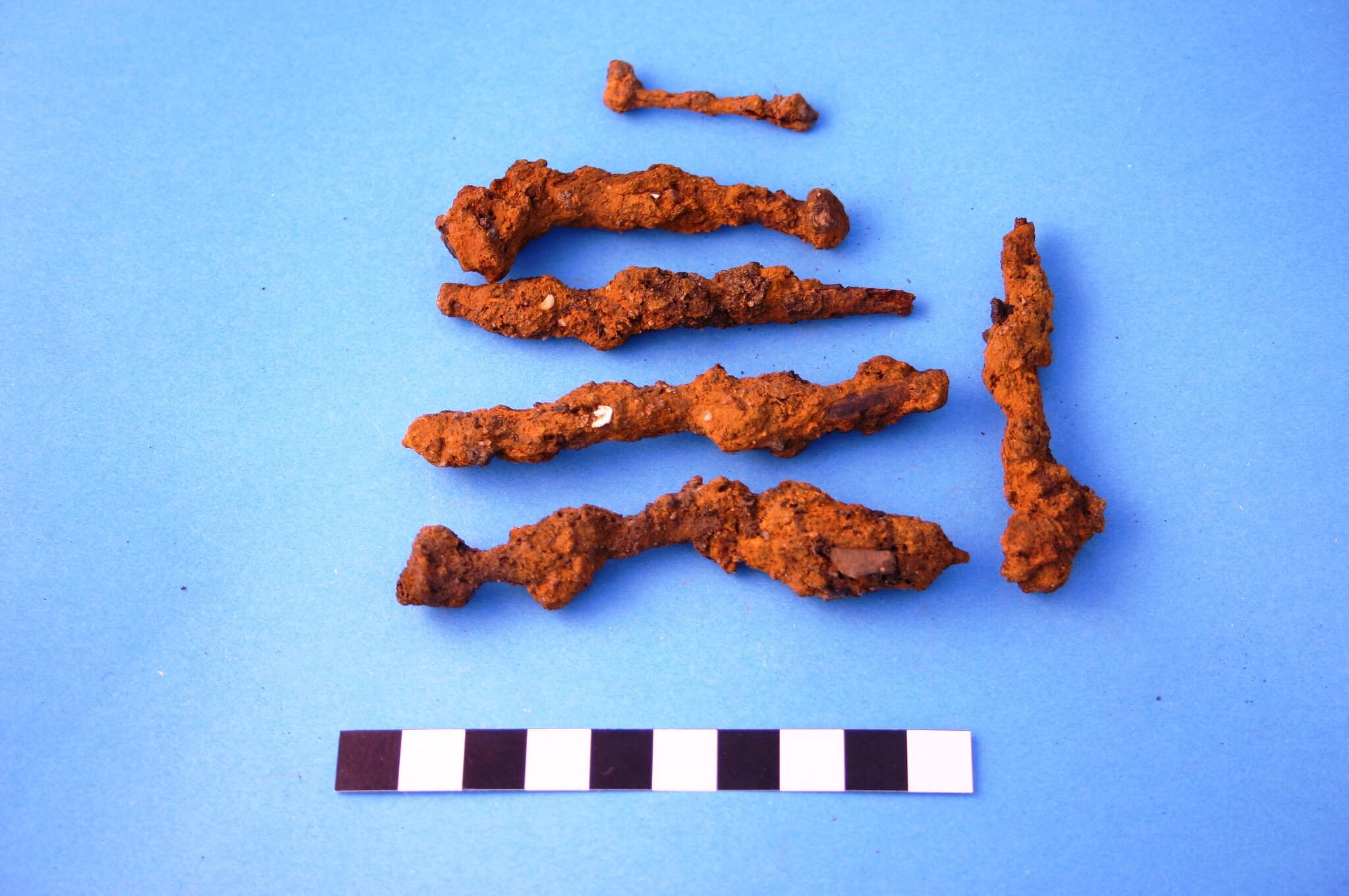 Six head and shafts of wire iron alloy nails. Head types cannot be determined due to rust and encrustation. Manufacturing period is from the 1850s.