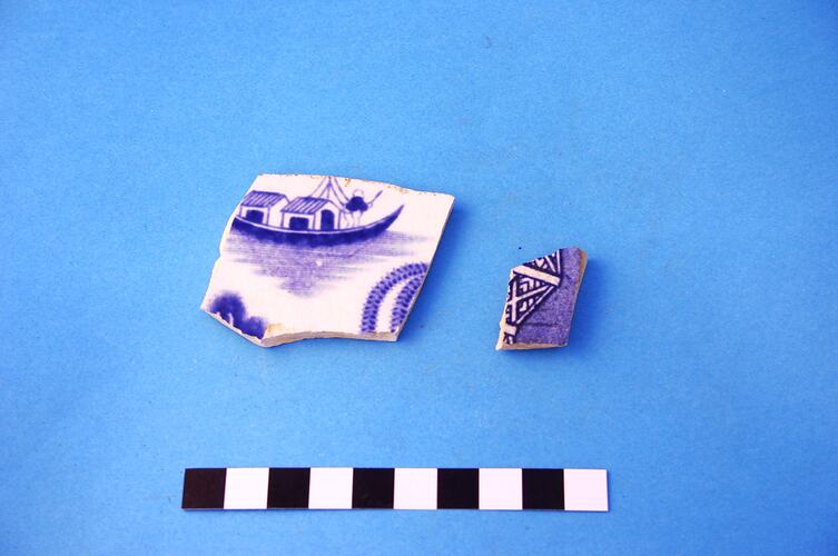 Two earthenware base fragments from two different items, possibly plates. One piece appears to be from a large plate or other larger item. Pattern is blue transfer print 'Willow'. Manufacturing date range is circa 1805 to circa 1900.