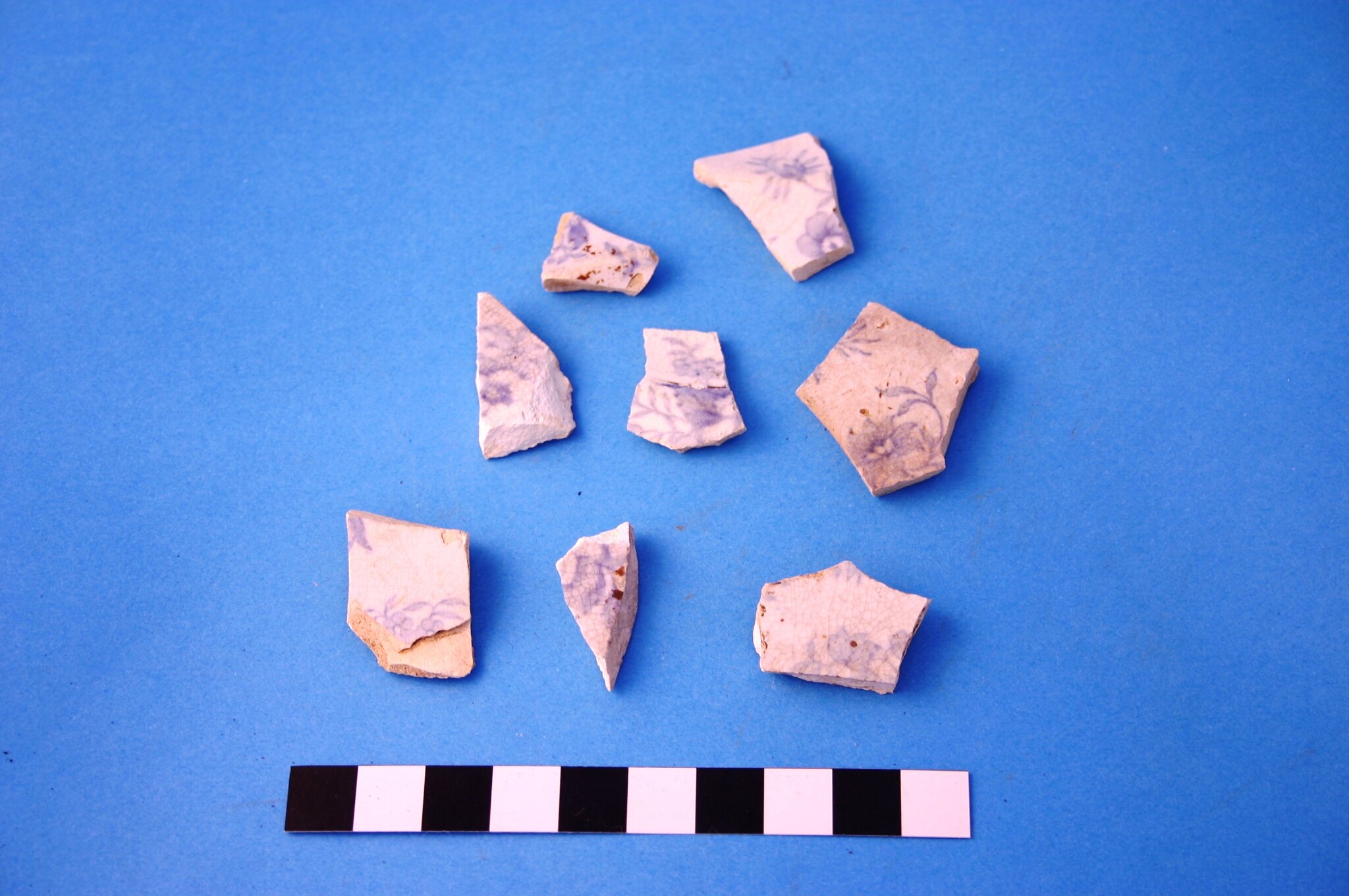 Eight fragments of earthenware plate that are from at least 2 separate items. Transfer print is blue 'Asiatic Pheasants', popular in the second half of the 19th century and into Edwardian times.
