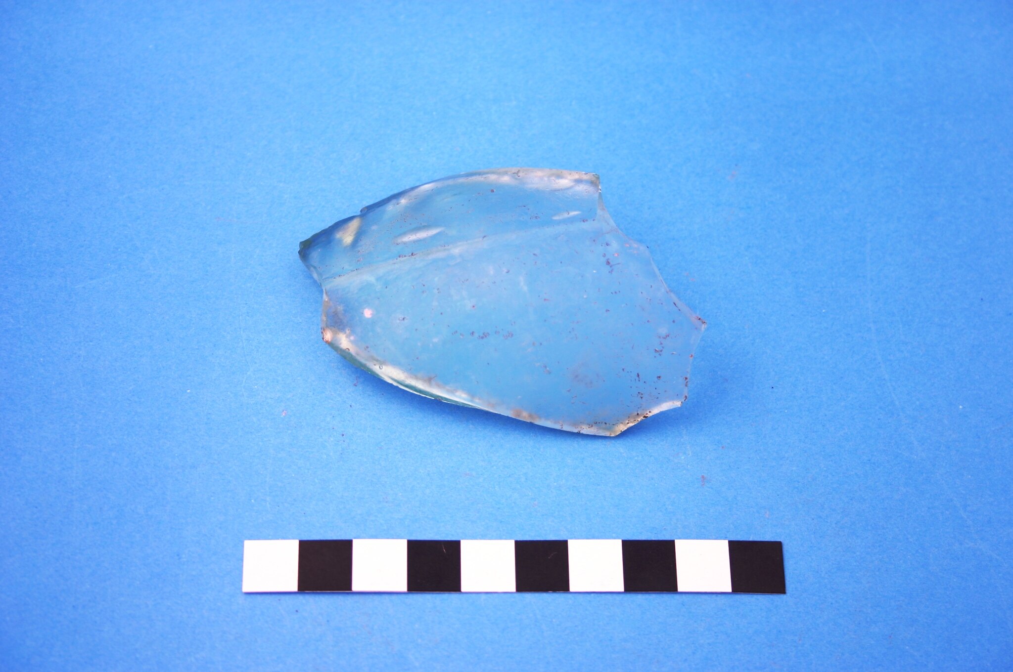 One fragment of a light green glass torpedo-shaped soda bottle. Manufactured after 1814.