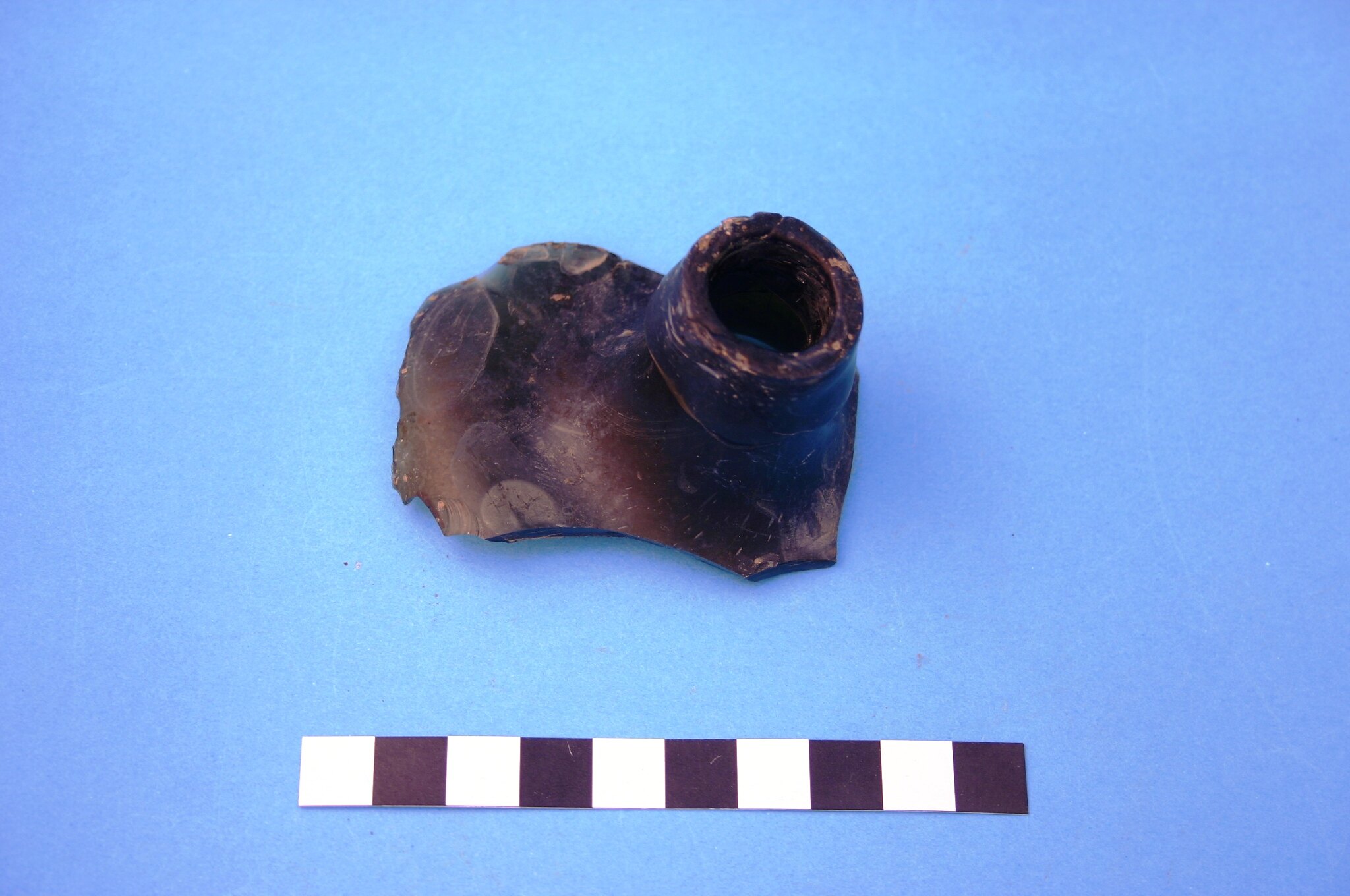One finish and partial shoulder of a dark green glass case bottle. The finish has been down tooled and would have been manufactured between circa 1820 and circa 1920.