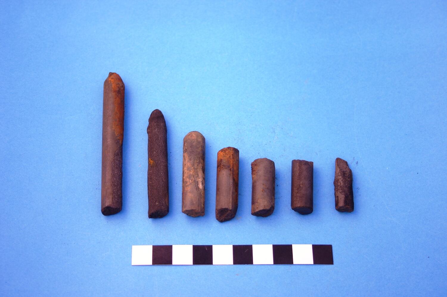 Seven fragments of carbon rod. At least one has a pointed contact point at one end. The rods are either from batteries or arc lighting.