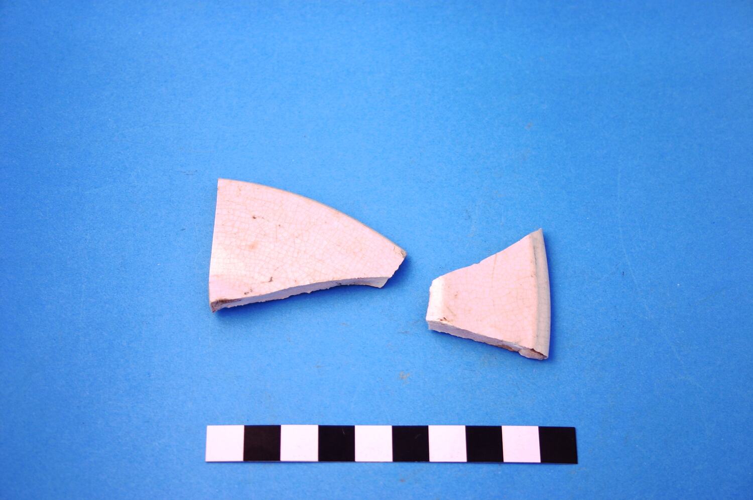 Two pieces of white-glazed earthenware from the rim of a plate (both are from the same item) with a scroll moulded design that is typical of 'White Granite'. Manufactured between the 1840s and circa 1930.