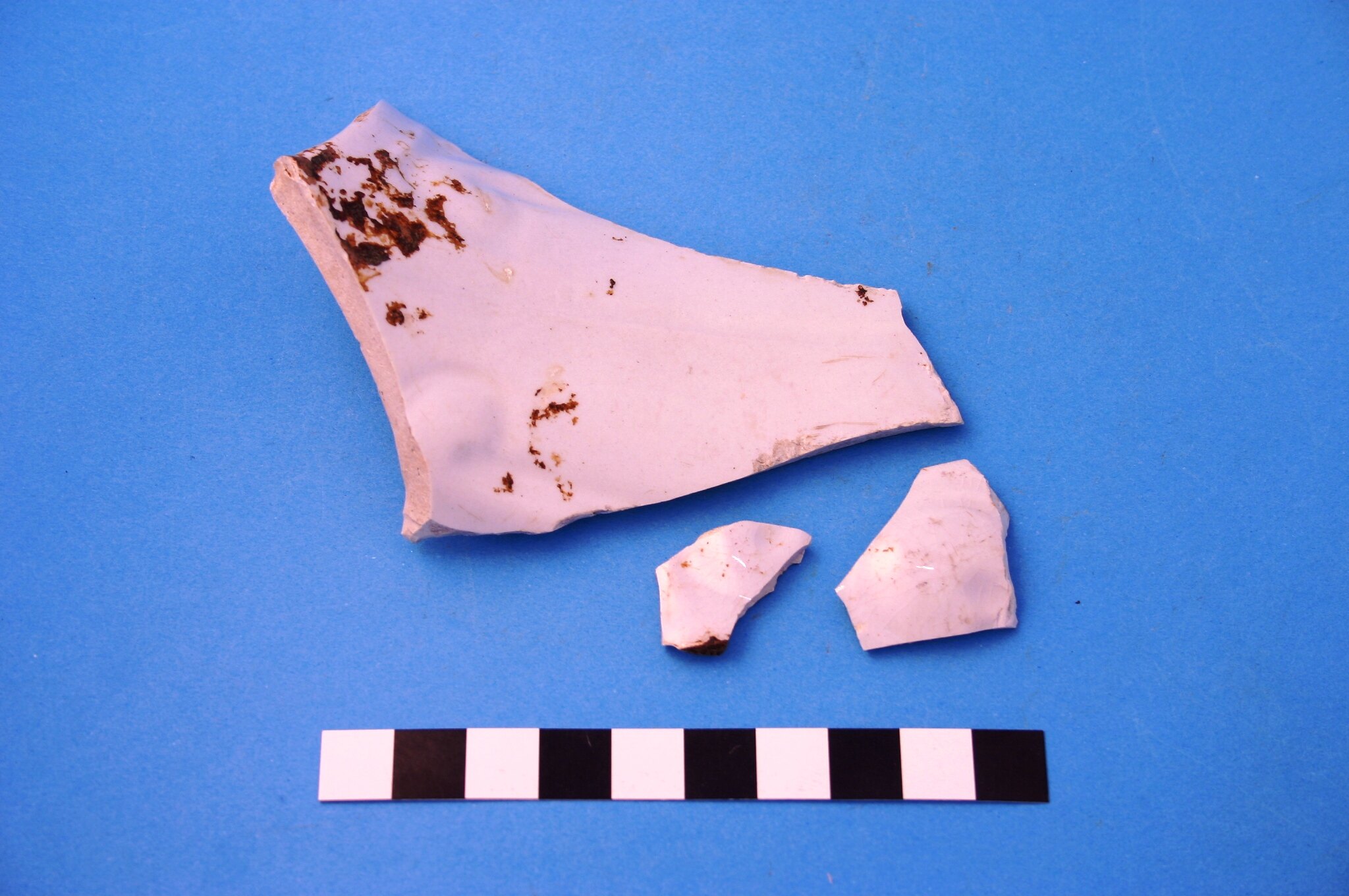 Three pieces of white-glazed high-fired earthenware from a large jug with scroll moulded design that is typical of 'White Granite'. Jug may have been used in the kitchen or formed part of a toilet set. Manufactured between the 1840s and circa 1930.