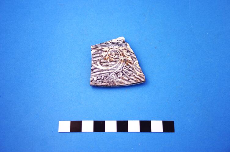 One fragment from the rim of an earthenware plate. Transfer print is grey 'Rhine', probably manufactured in the latter part of the 19th century.