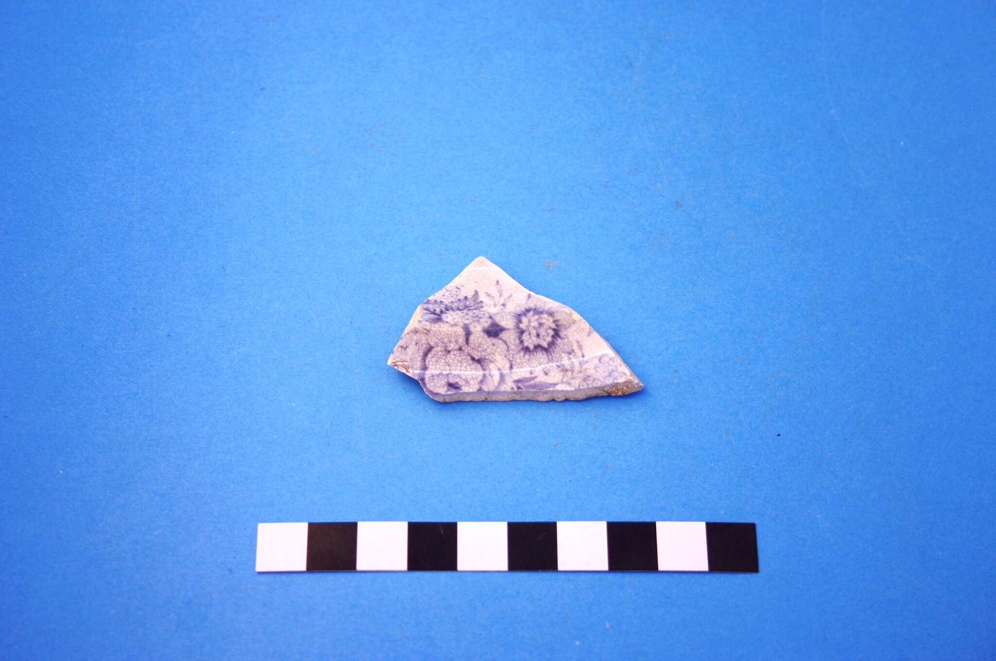 One fragment from an earthenware plate. Transfer print is blue/grey 'Asiatic Pheasants', popular in the second half of the 19th century and into Edwardian times.