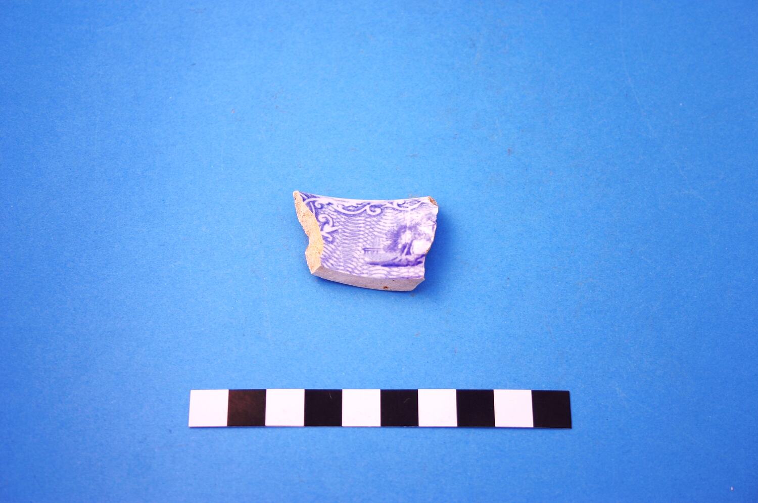 One earthenware rim fragment from a cup. Decoration is blue transfer print in an unidentified pattern. Manufacture date is circa 1805 to circa mid-20th century.