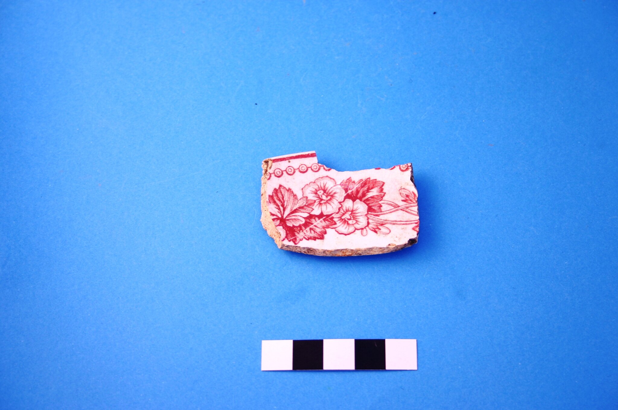 One rim fragment of a saucer. Decoration is transfer print of an unidentified pattern in red. Earliest date of manufacture is circa 1818.