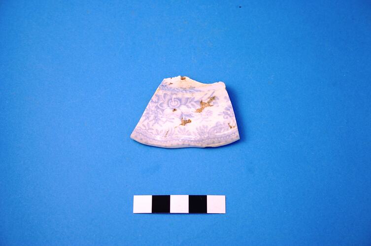 One earthenware plate rim fragment. Transfer print is blue/grey 'Asiatic Pheasants', popular in the second half of the 19th century and into Edwardian times.