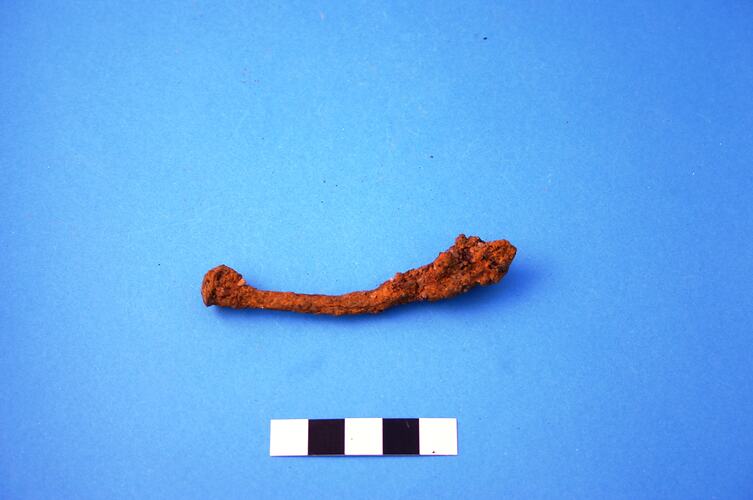 One almost complete wire iron alloy nail. Head type appears to be a rose head. Manufacturing period is from the 1850s.