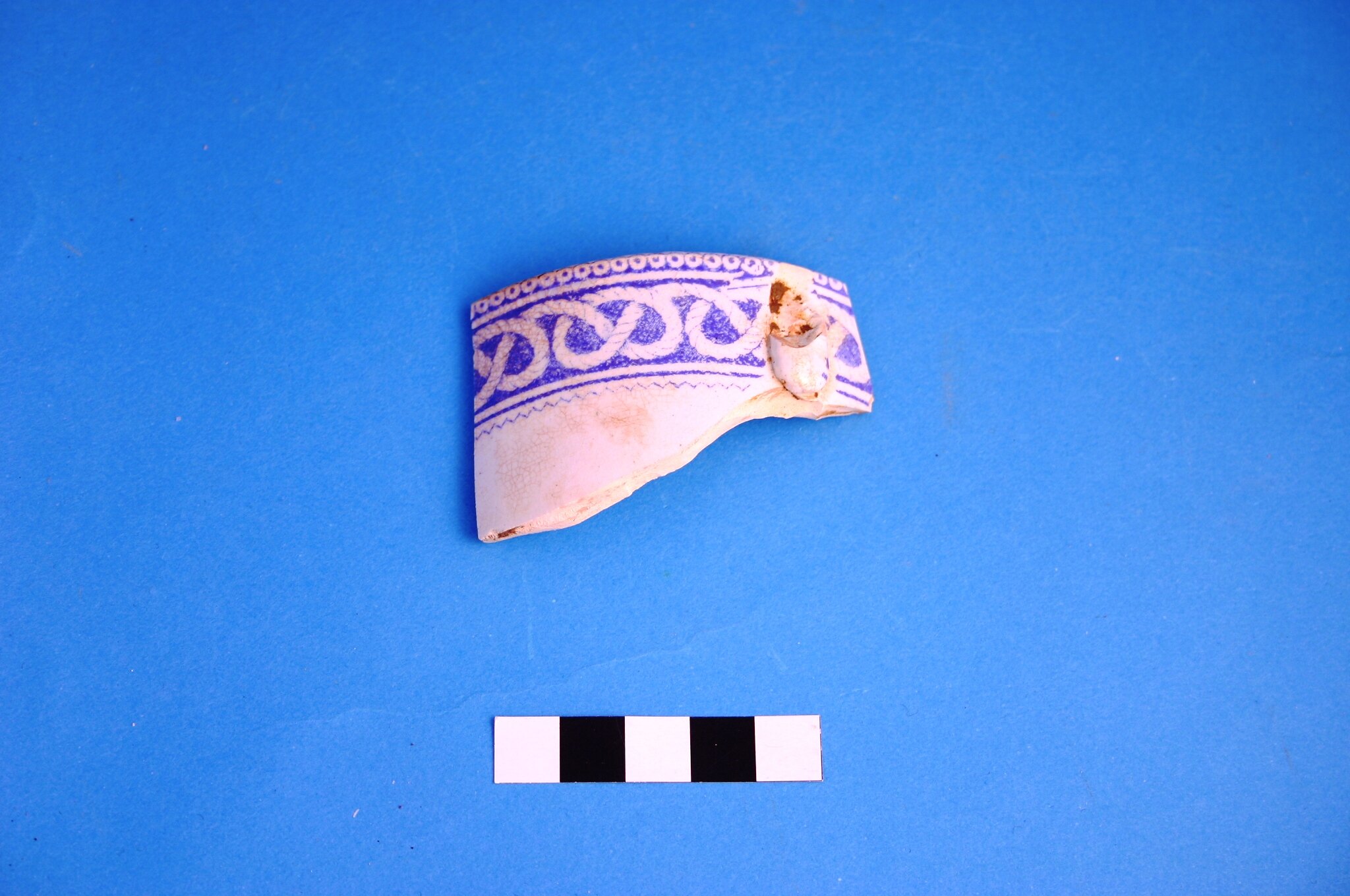 One earthenware cup rim fragment. Decoration is Saxon blue transfer print in an unidentified pattern. Manufacture date is circa 1805 to circa mid-20th century.