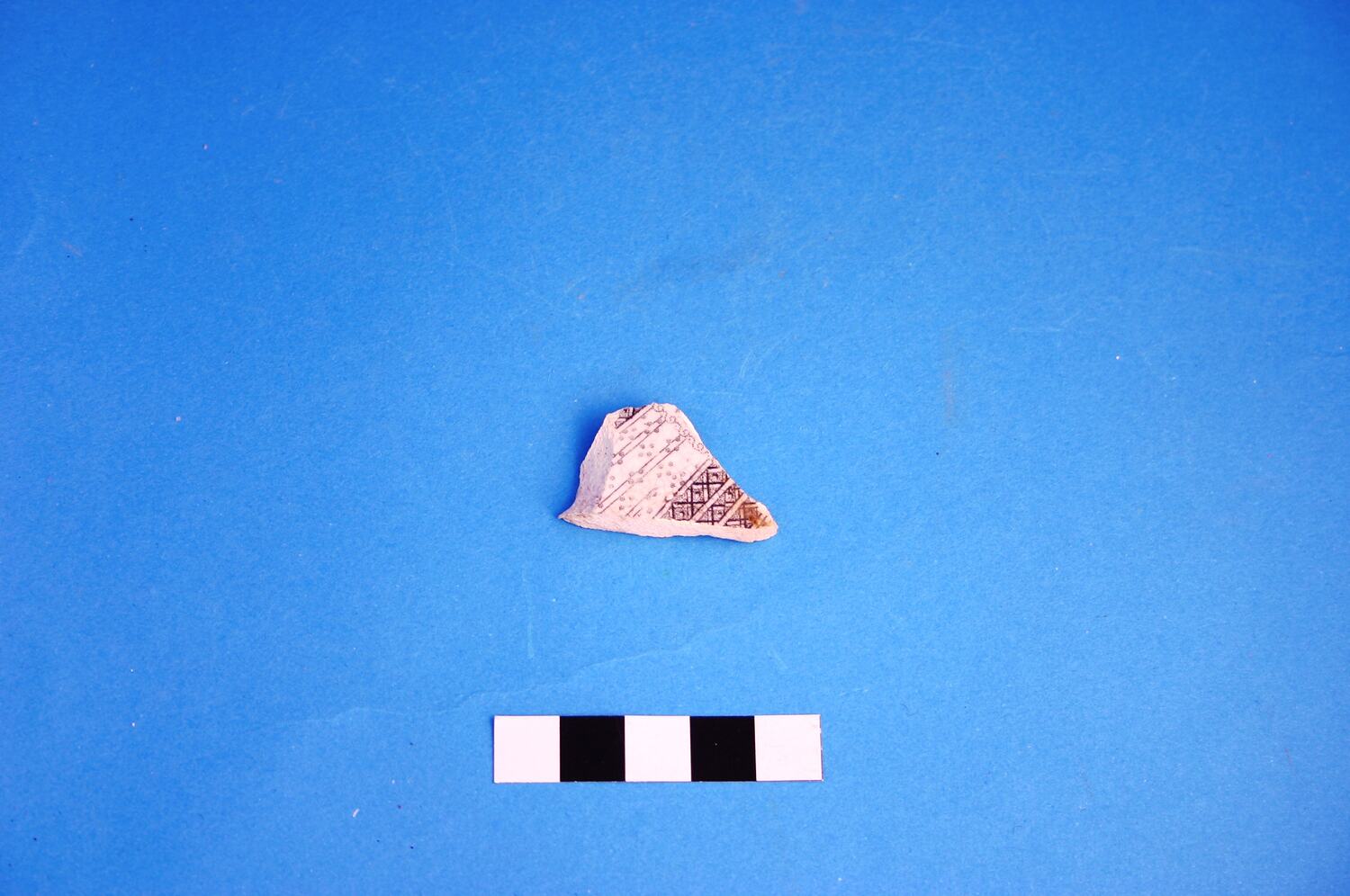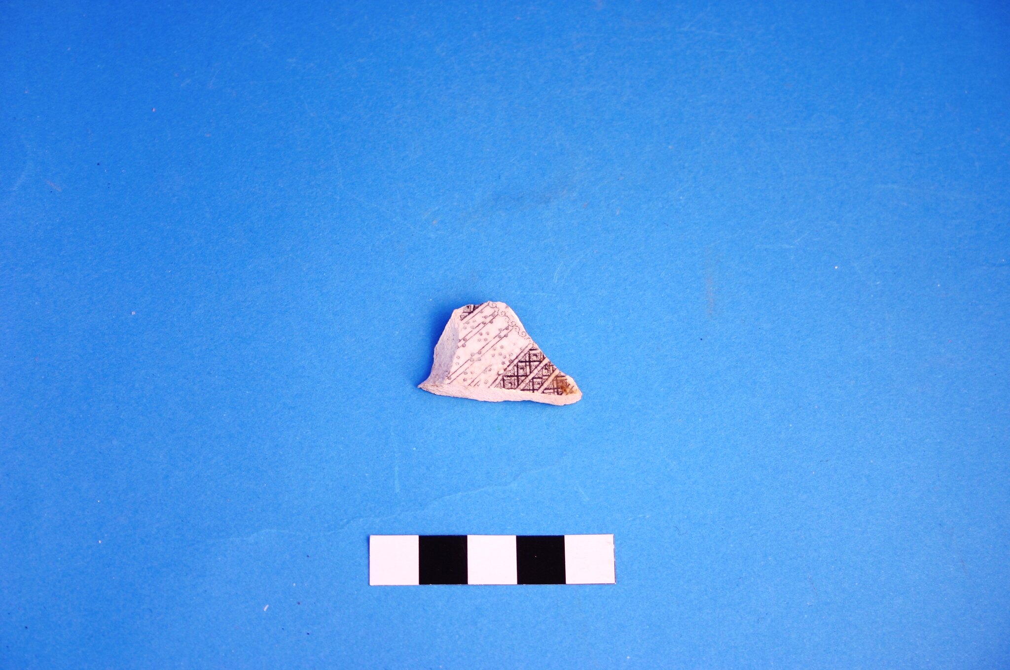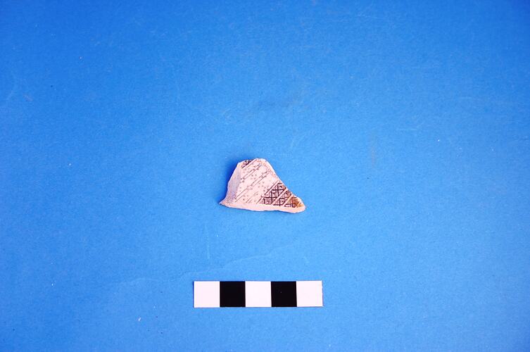 One earthenware fragment possibly from a large bowl. Decoration is black transfer print in an unidentified pattern. Manufacture date is circa 1805 to circa mid-20th century.