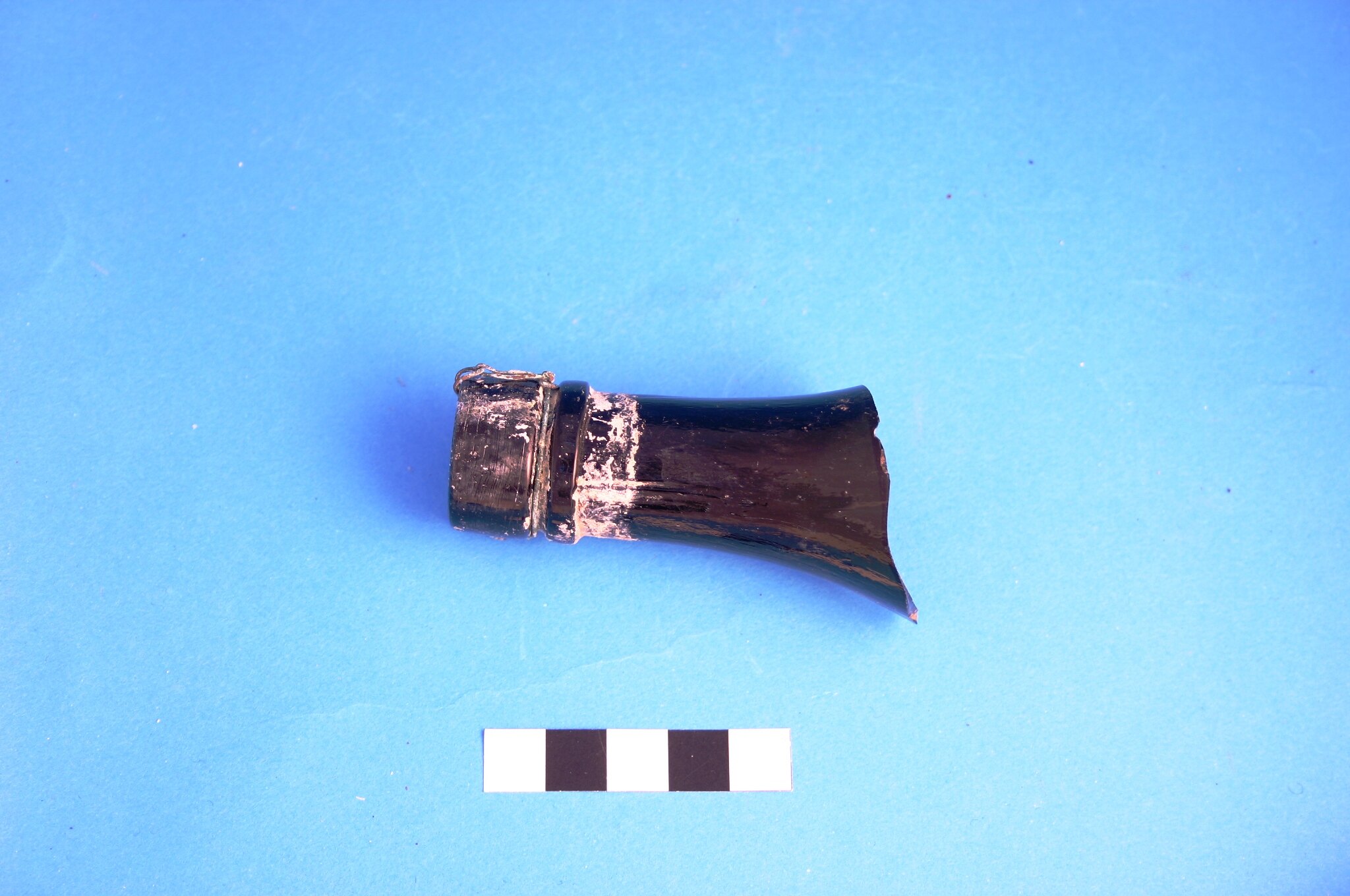 One finish and neck from a dark green beer or wine bottle that still has the copper alloy bottle wire attached and traces of the label just below the finish. The finish has been tooled and would have been manufactured between circa 1820 and circa 1920.
