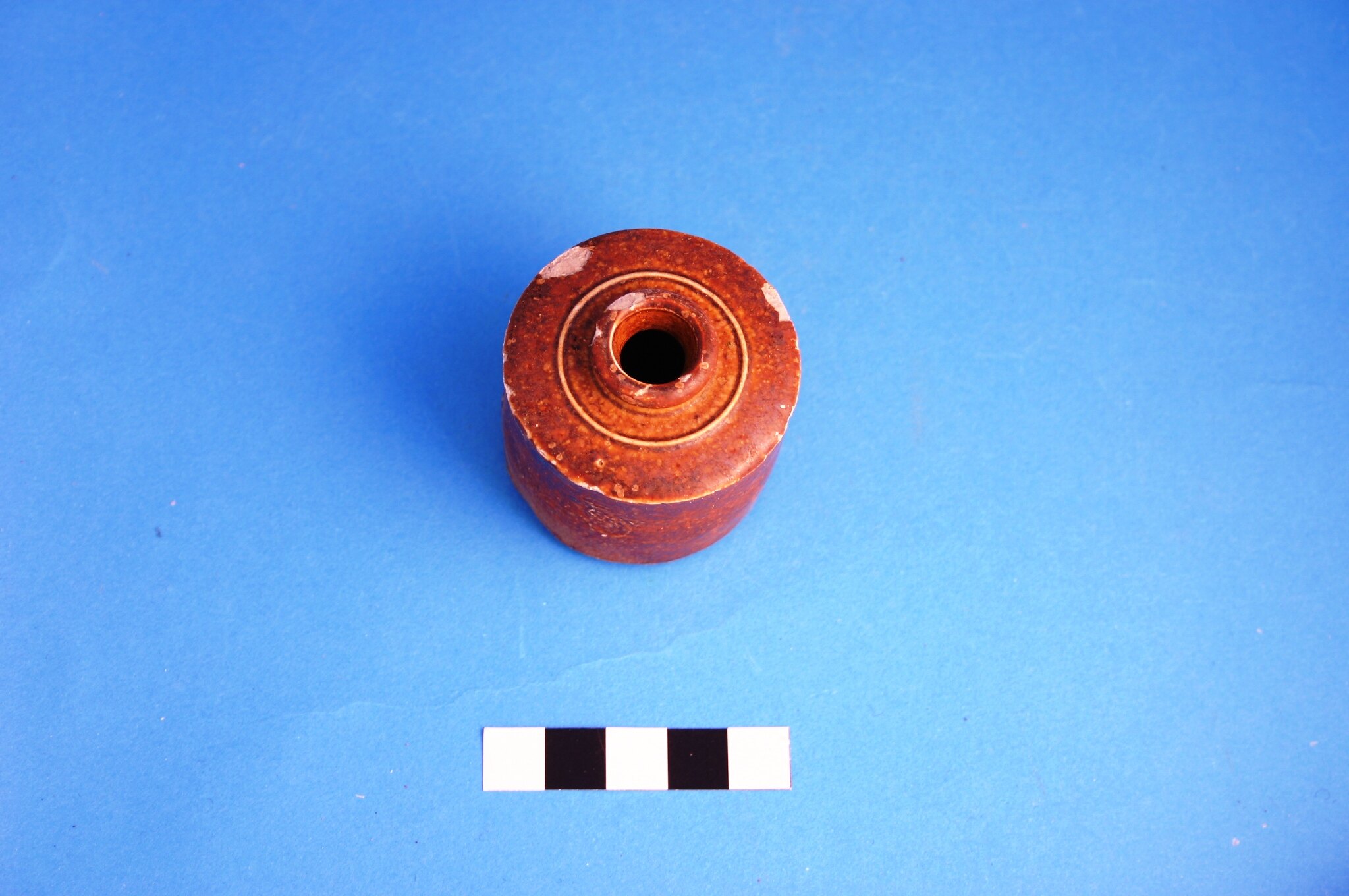 One almost complete brown coloured saltglazed stoneware penny ink well bottle.