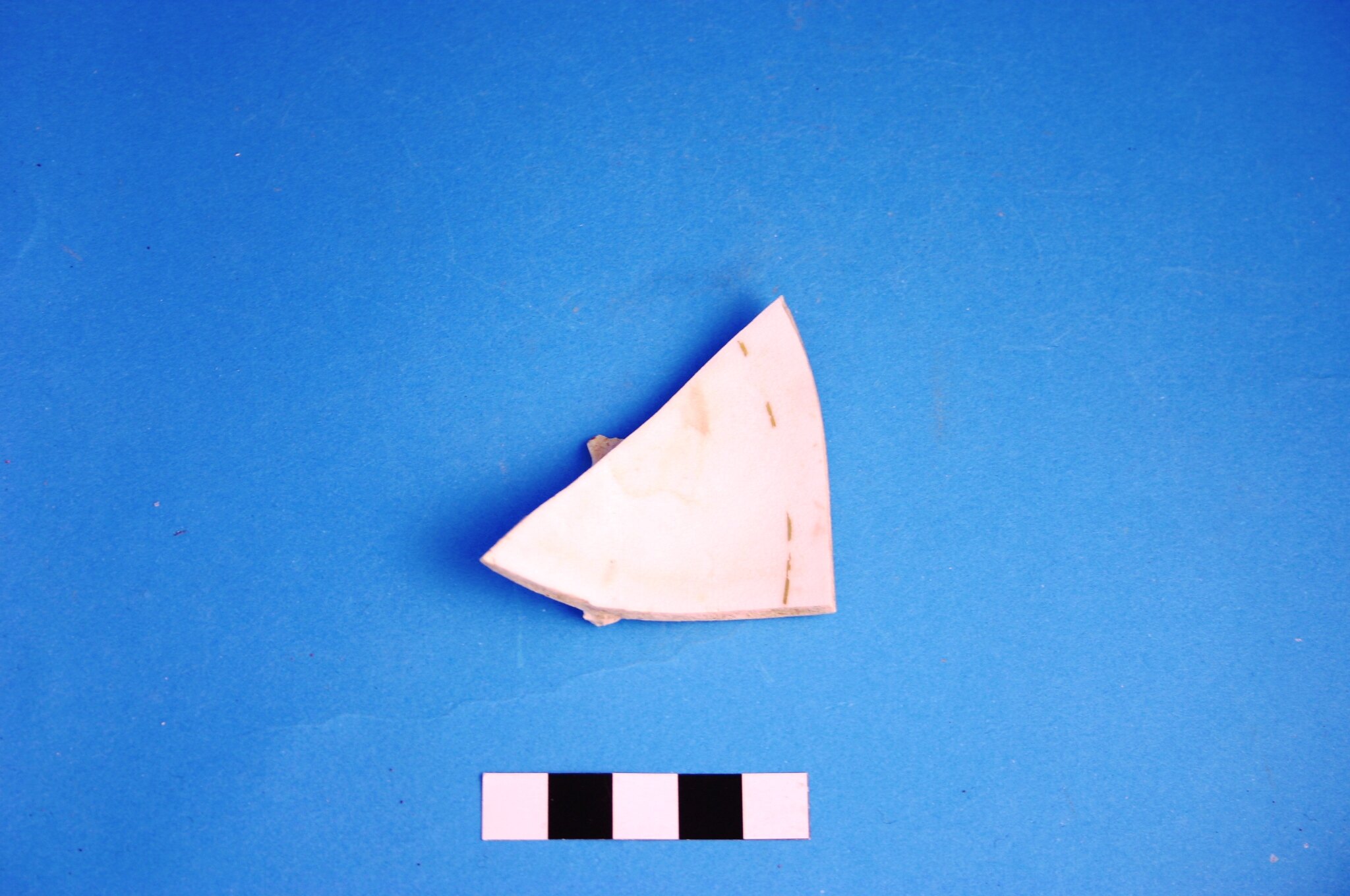 One fragment of a low quality porcelain saucer base with a single thin band of gilding (may have been more on the rim). This type of cheap gilded decoration was manufactured from the mid-19th century.