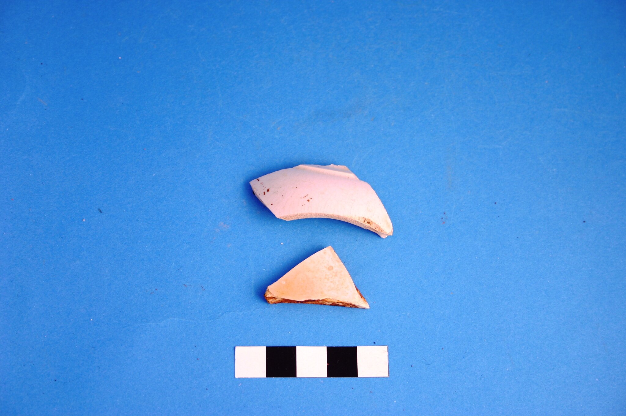 Two fragments of white-glazed, high-fired earthenware from unidentified items. Manufacture date is circa 1805 to circa mid-20th century.