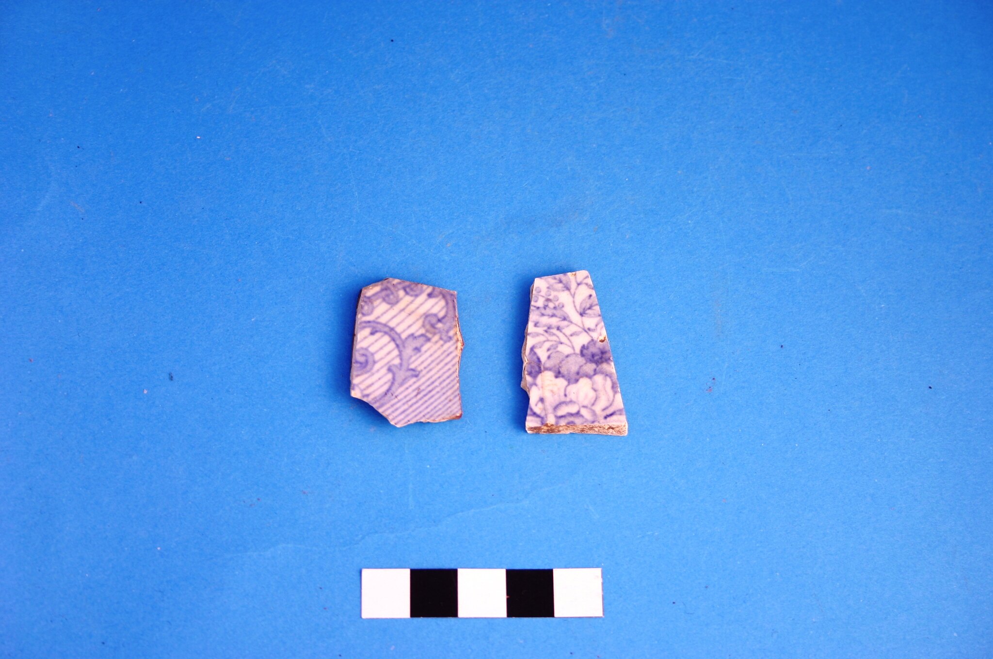 Two fragments of earthenware from unidentified items. Decoration is blue transfer print in an unidentified pattern. Manufacture date is circa 1805 to circa mid-20th century.