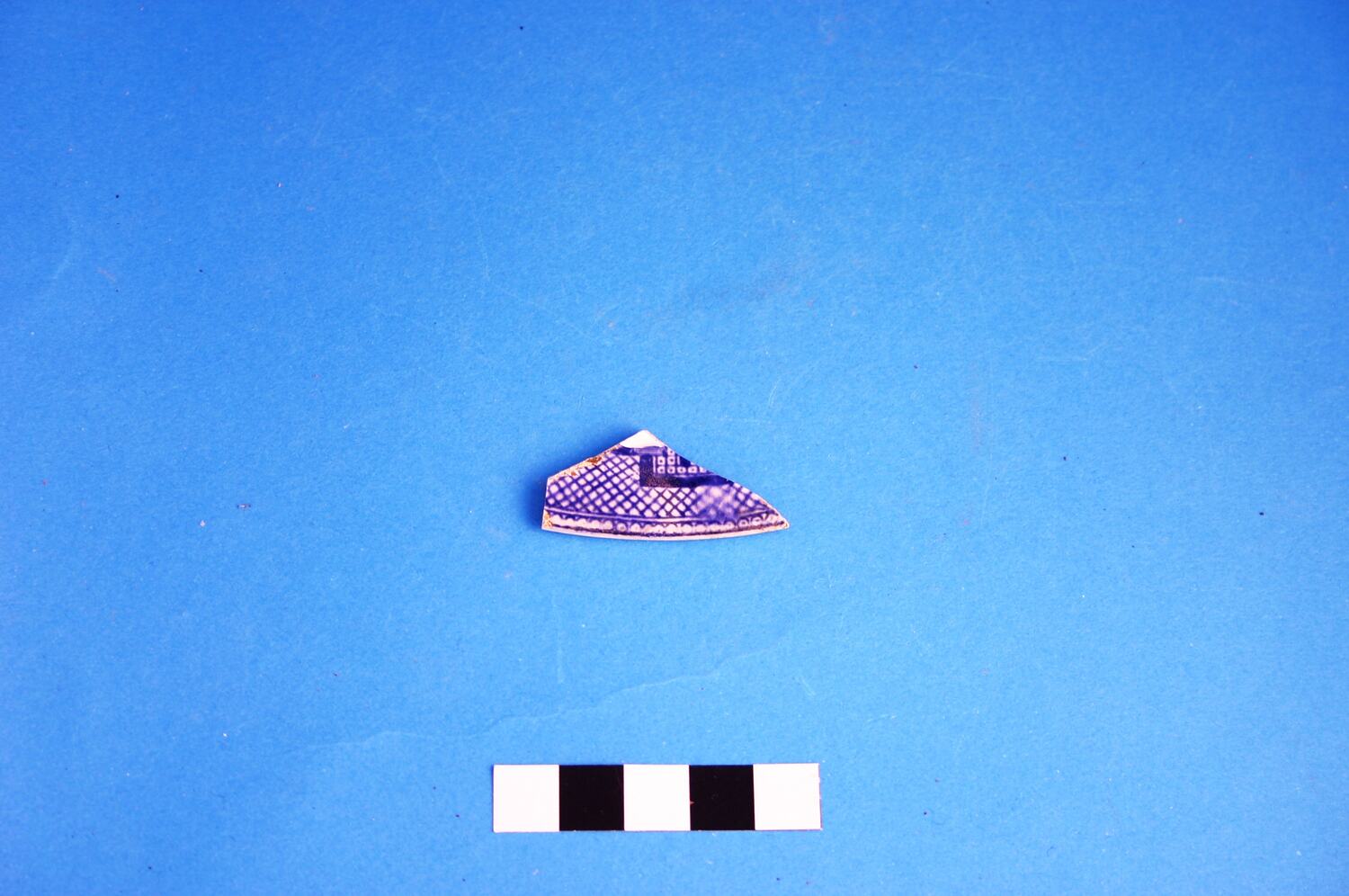 One earthenware fragment from the rim of a plate. Pattern is blue transfer print 'Willow'. Manufacturing date range is circa 1805 to circa 1900.
