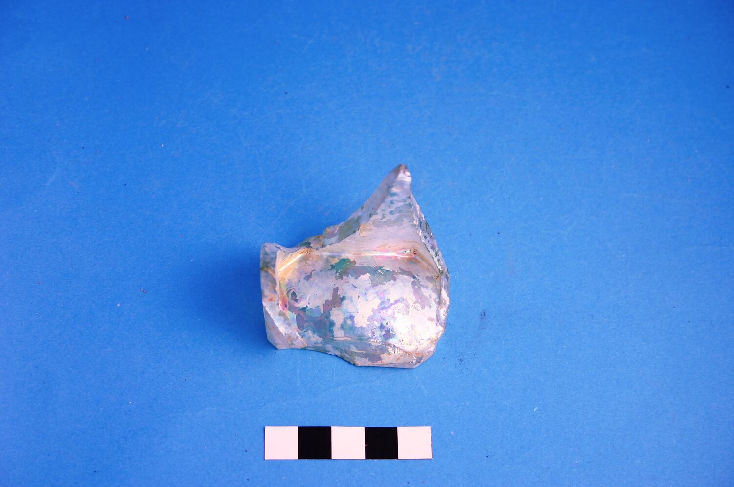 One light green glass bottle base fragment. Shape of bottle is oblong with chamfered corners. Was manufactured in a vented mould with a separate base plate, suggesting it was made after circa 1874 but before circa 1900.