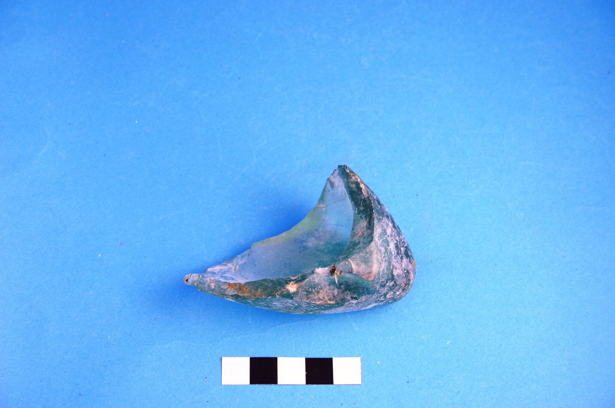 One fragment from the base of a light green glass torpedo-shaped soda bottle. Manufactured after 1814.