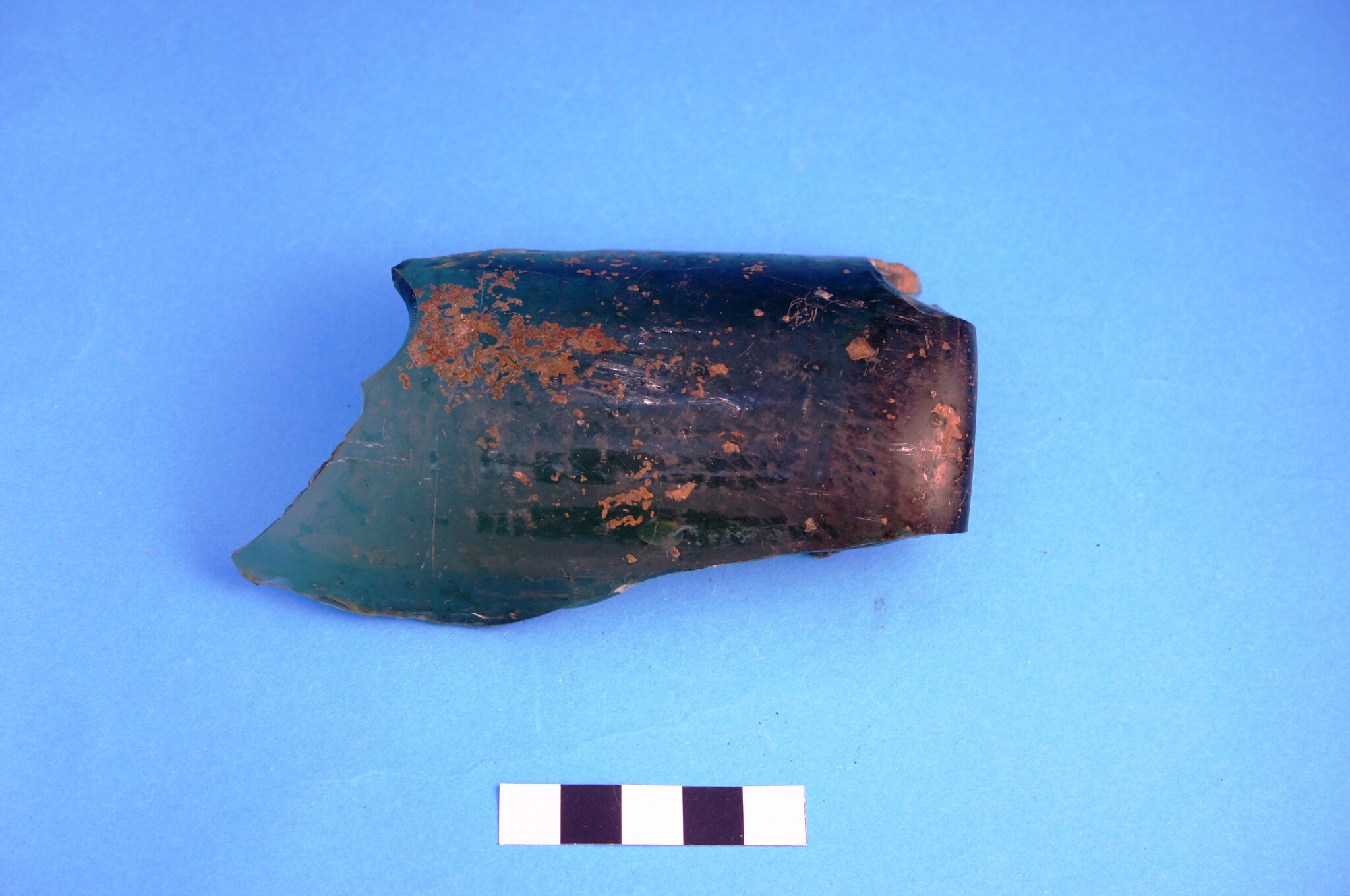 One piece from the body of a medium green glass beer or wine bottle. The piece has horizontal marks and striations indicating it was manufactured in a turn/paste mould. Manufactured after circa 1865.