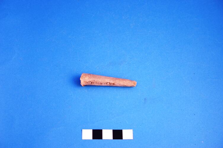 One clay pipe stem with a maker's mark: 'C. CROP', 'LONDON'. Was manufactured by Charles Crop of London between 1856 and circa 1891.