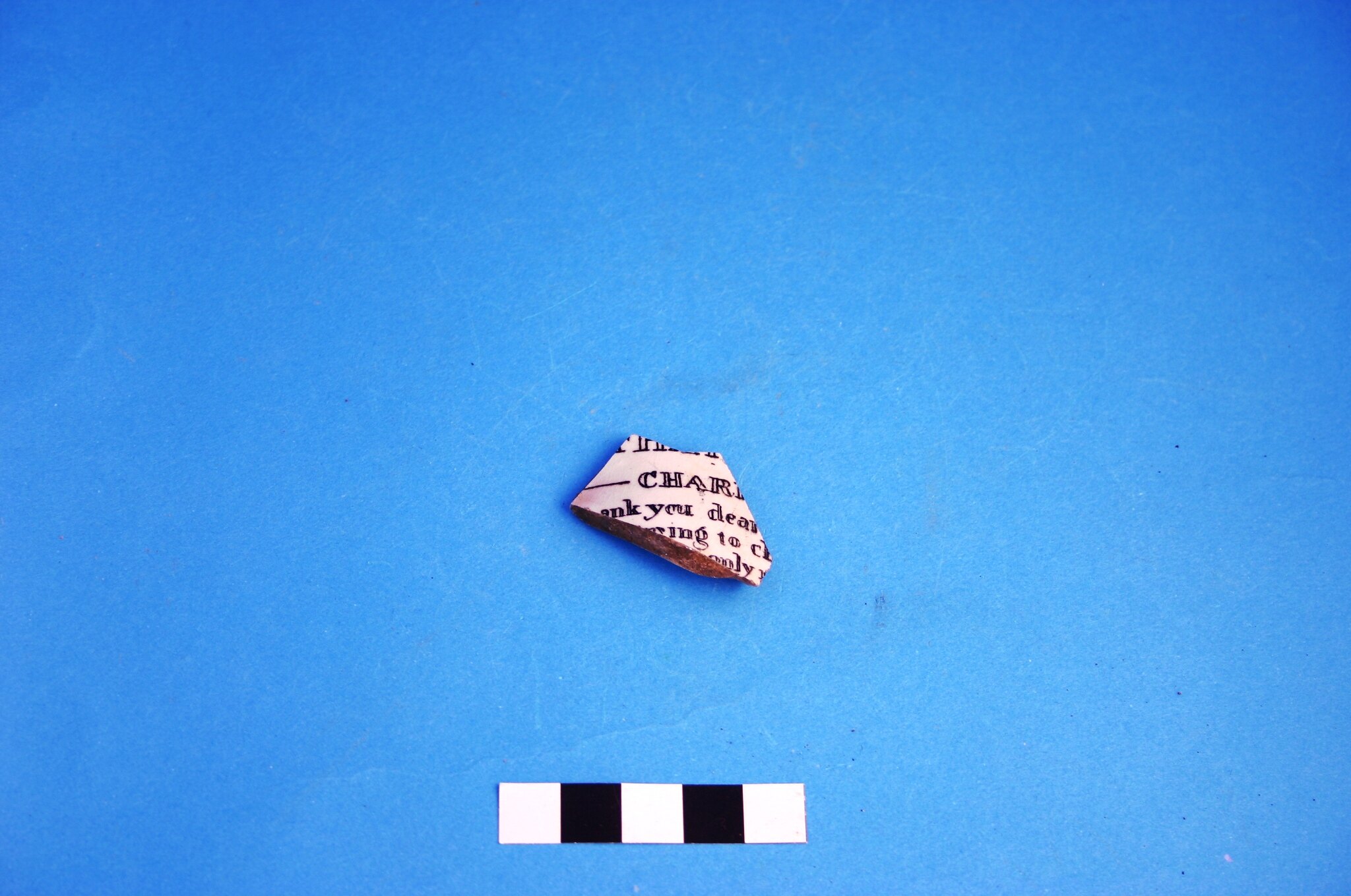 One fragment of an earthenware mug with decoration consisting of black transfer printed writing: 'CHAR.', '.ank you dear.', ing to c.', '..only.'. Manufactured after circa 1805.