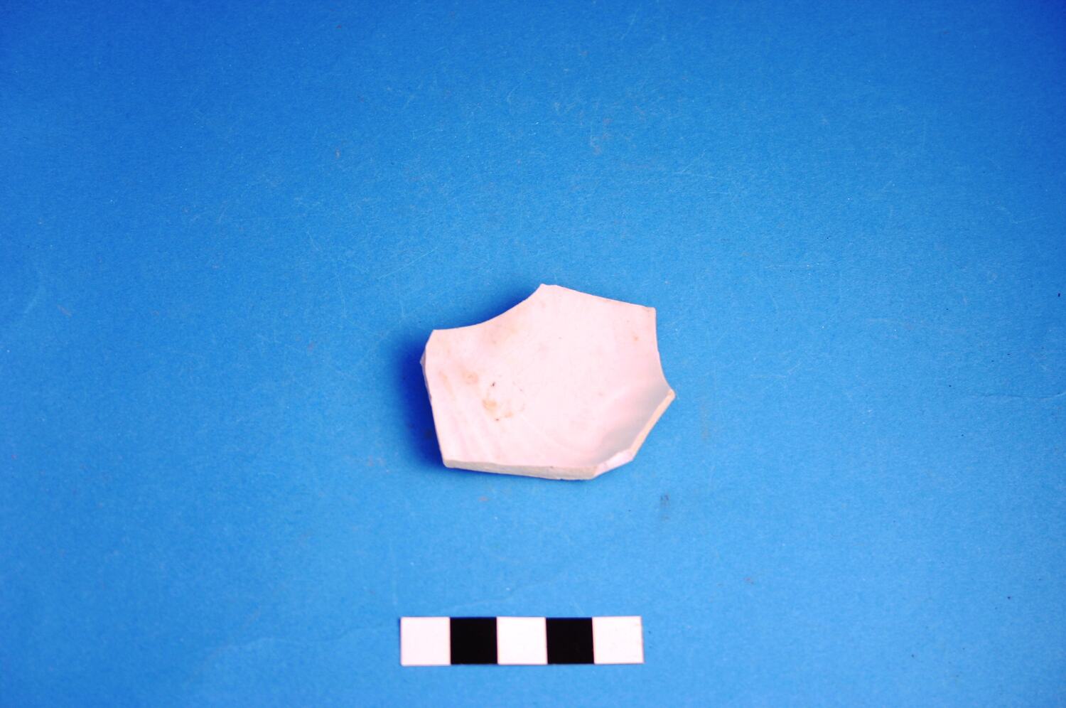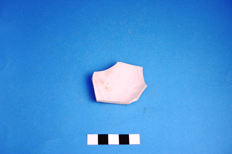 One high-fired earthenware fragment, possibly from a saucer. Decorated with a scroll moulded design that is typical of 'White Granite'. Manufactured between the 1840s and circa 1930.