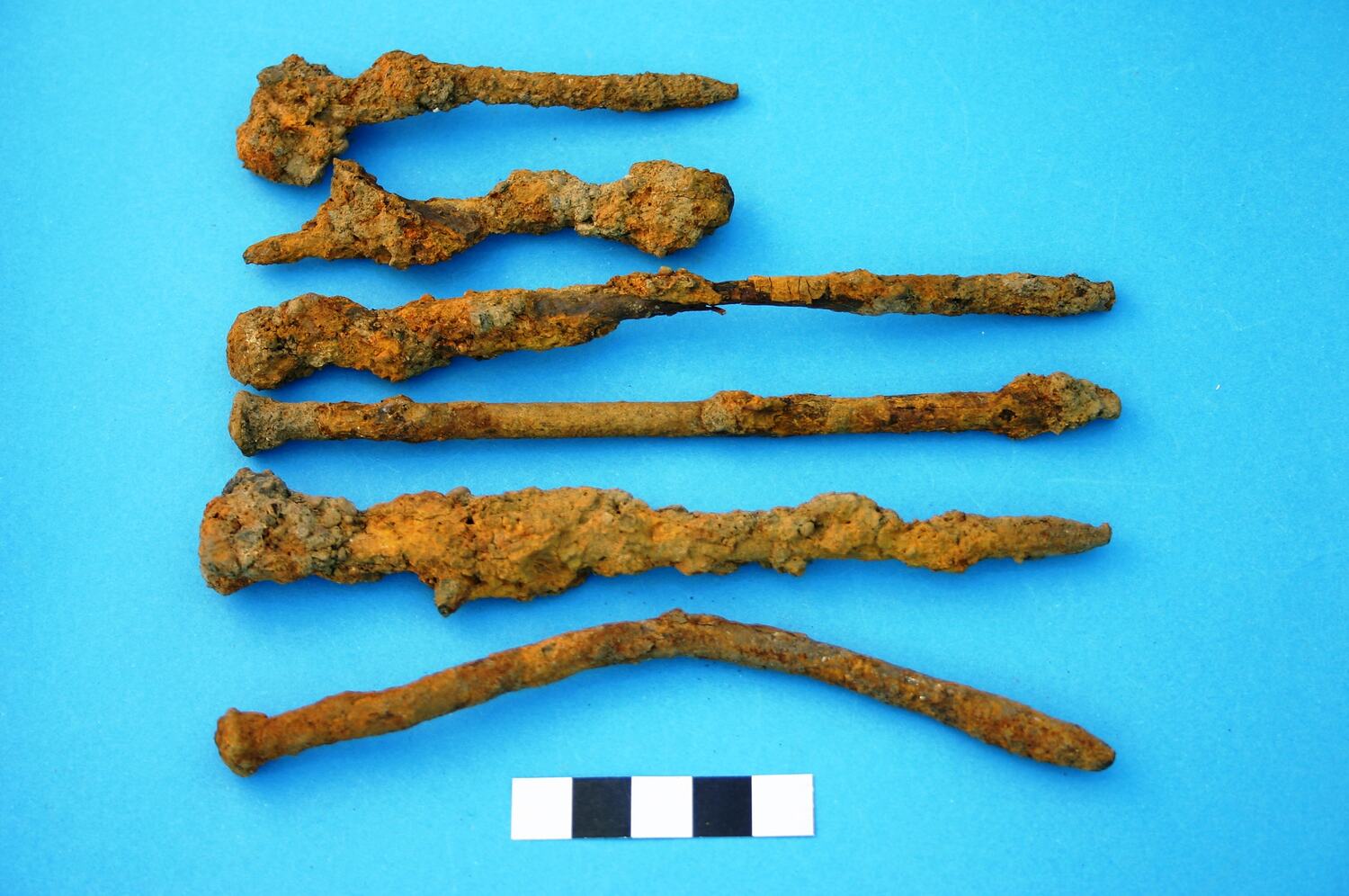 Six almost complete wire iron alloy nails. Head types cannot be determined due to rust and encrustation. Manufacturing period is from the 1850s.