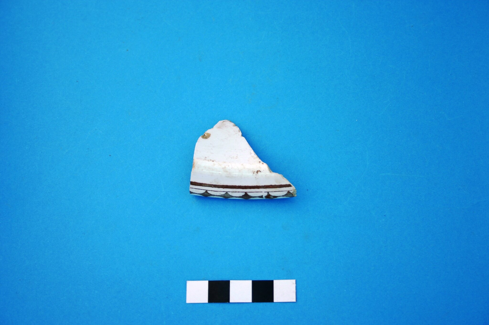 One earthenware rim fragment from a chamber pot. Decoration is brown transfer print in an unidentified pattern. Manufacture date is circa 1816 to circa mid-20th century.
