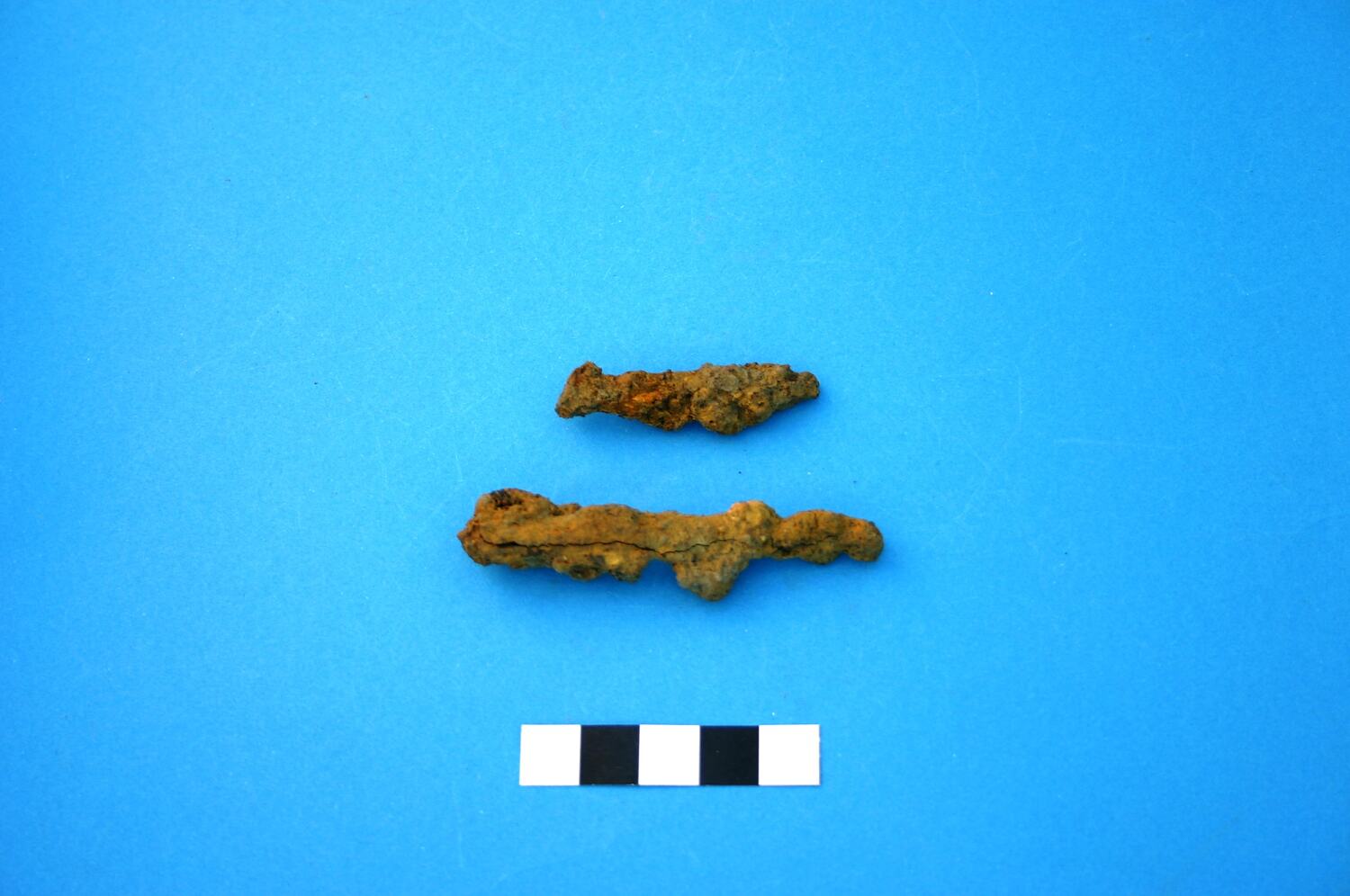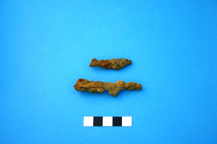 Two heads and shafts of wire iron alloy nails. Head types cannot be determined due to rust and encrustation. Manufacturing period is from the 1850s.