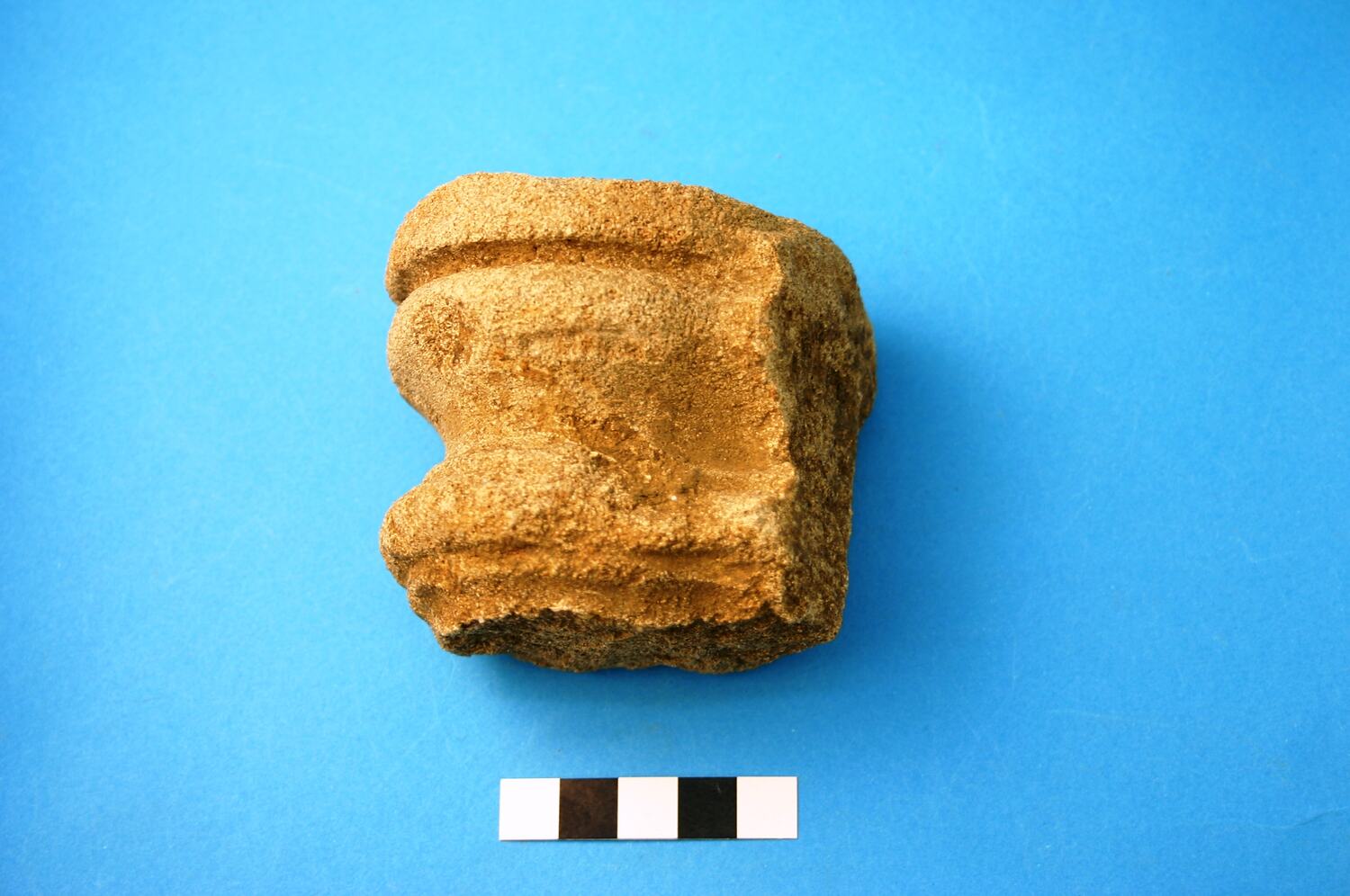 One fragment of sandstone scrollwork probably from architectural detailing or facing, for example part of a small capital above a narrow rib.