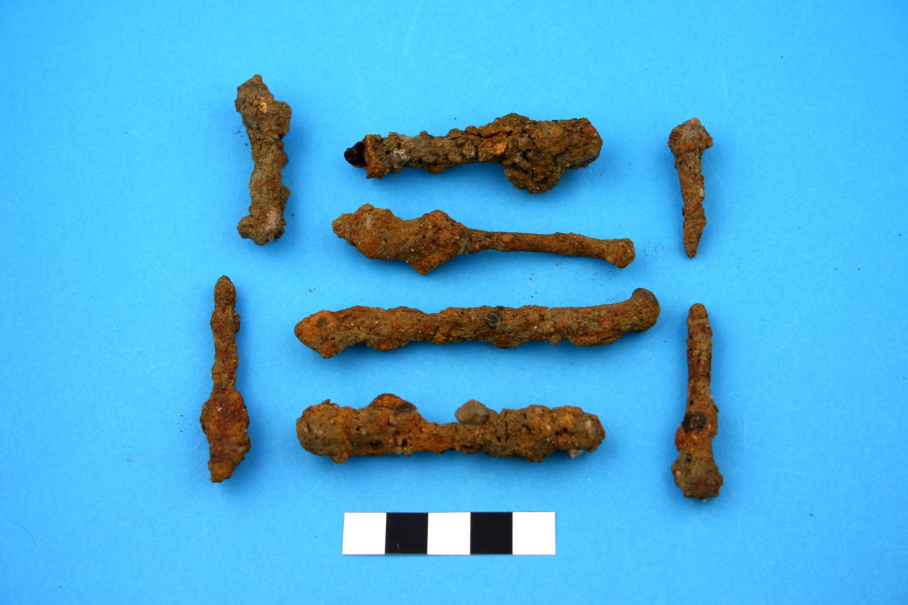 Eight almost complete wire iron alloy nails. Head type is indeterminable due to rust and encrustation. Manufacturing period is from the 1850s.