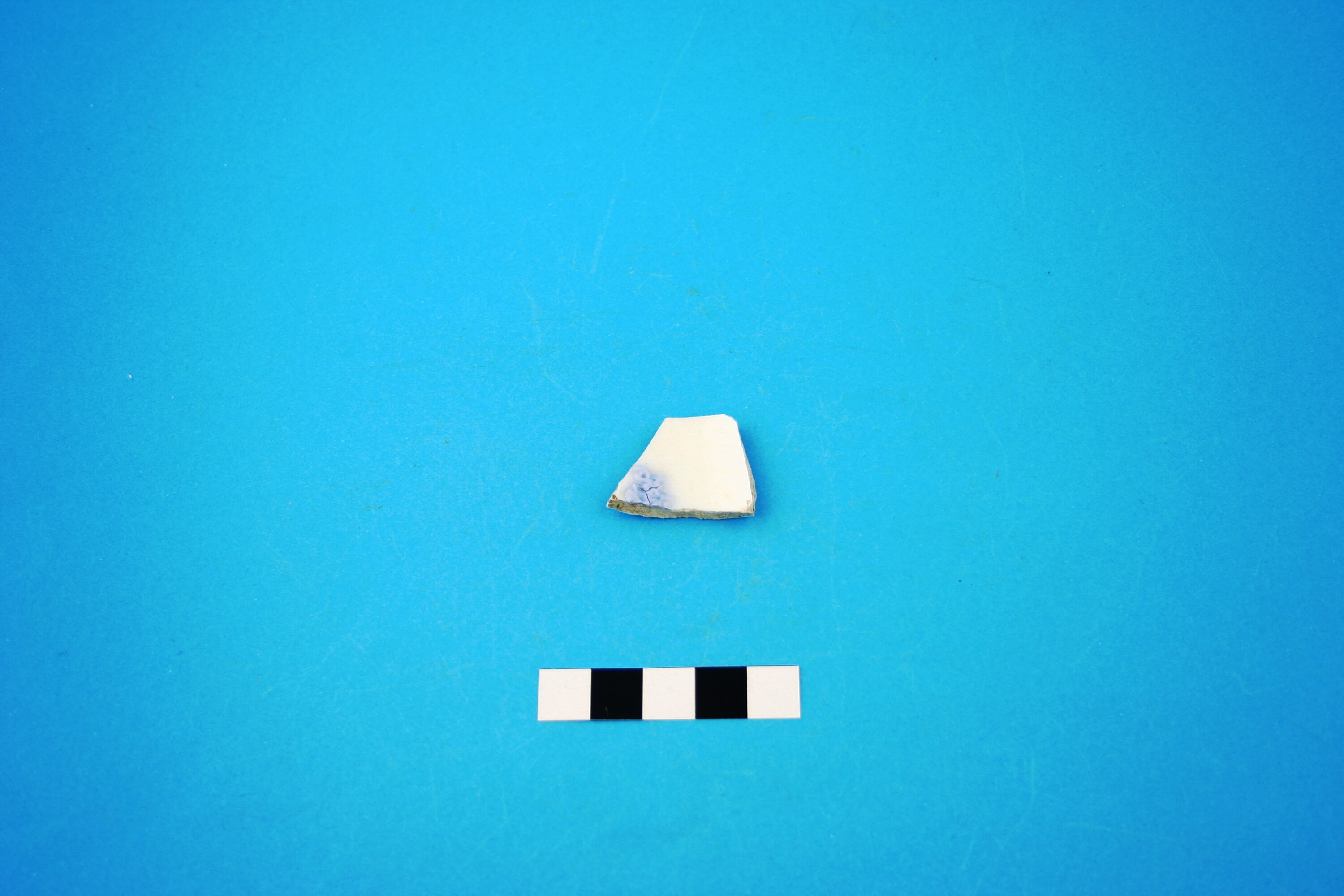 One fragment of a porcelain item, probably a saucer. The decoration is light blue applied grapevine sprig. The manufacture date range is circa 1820 to the late 19th century.