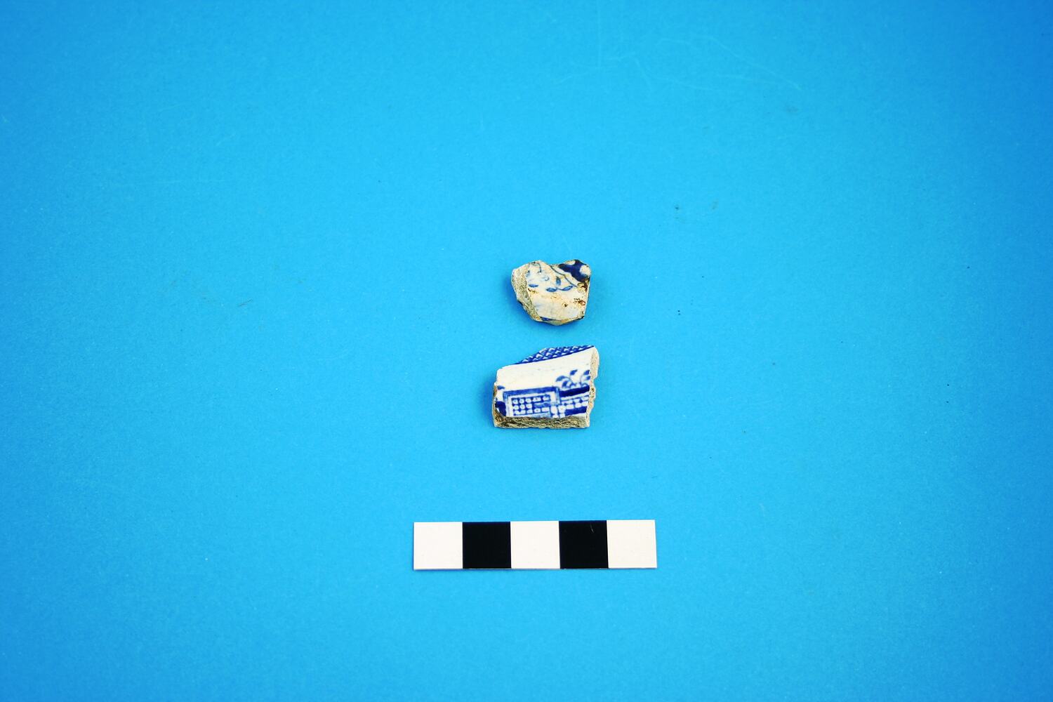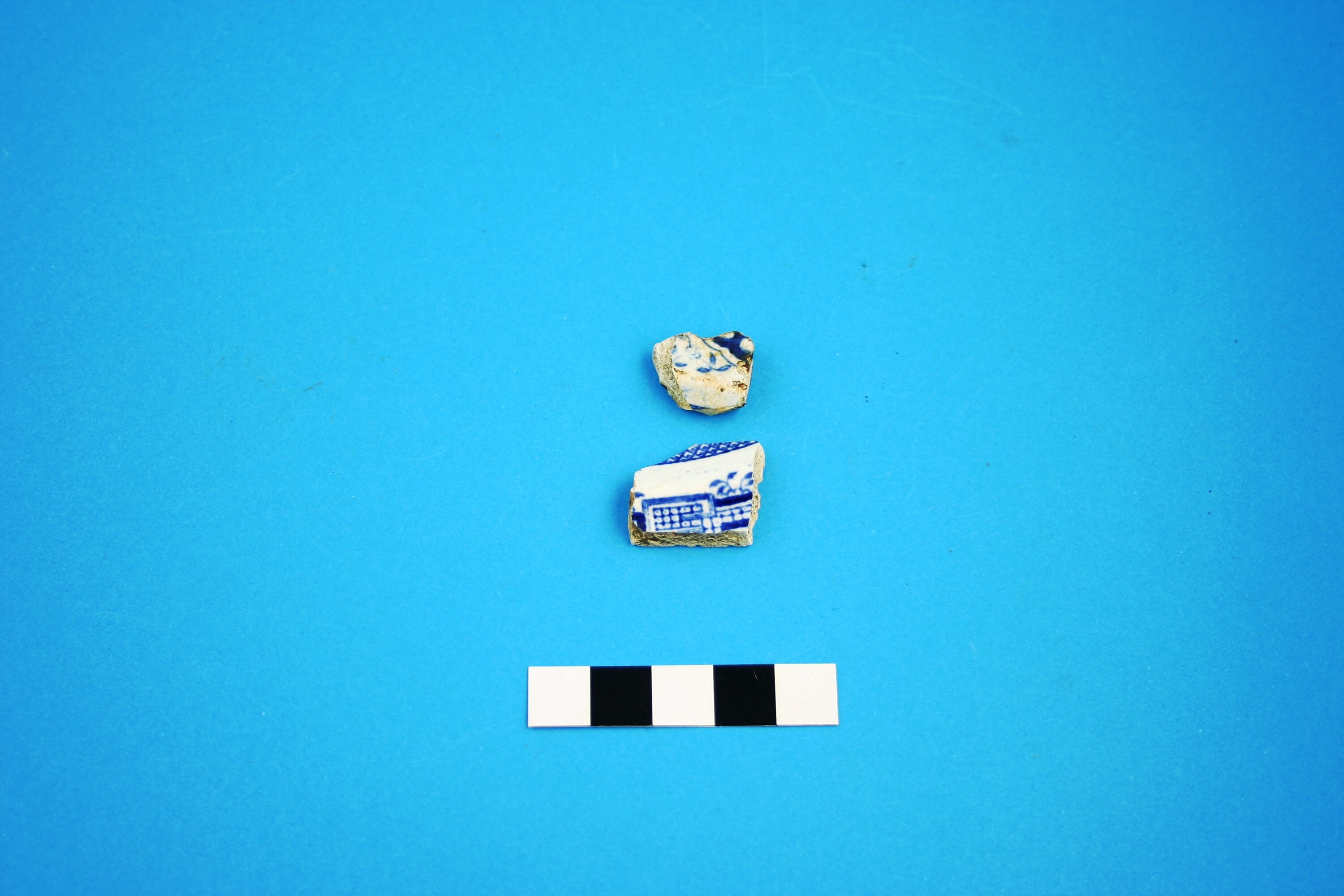 Two earthenware plate fragments. Pattern is blue transfer print 'Willow'. Manufacturing date range is circa 1805 to circa 1900.