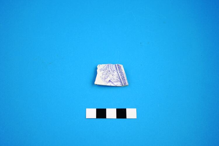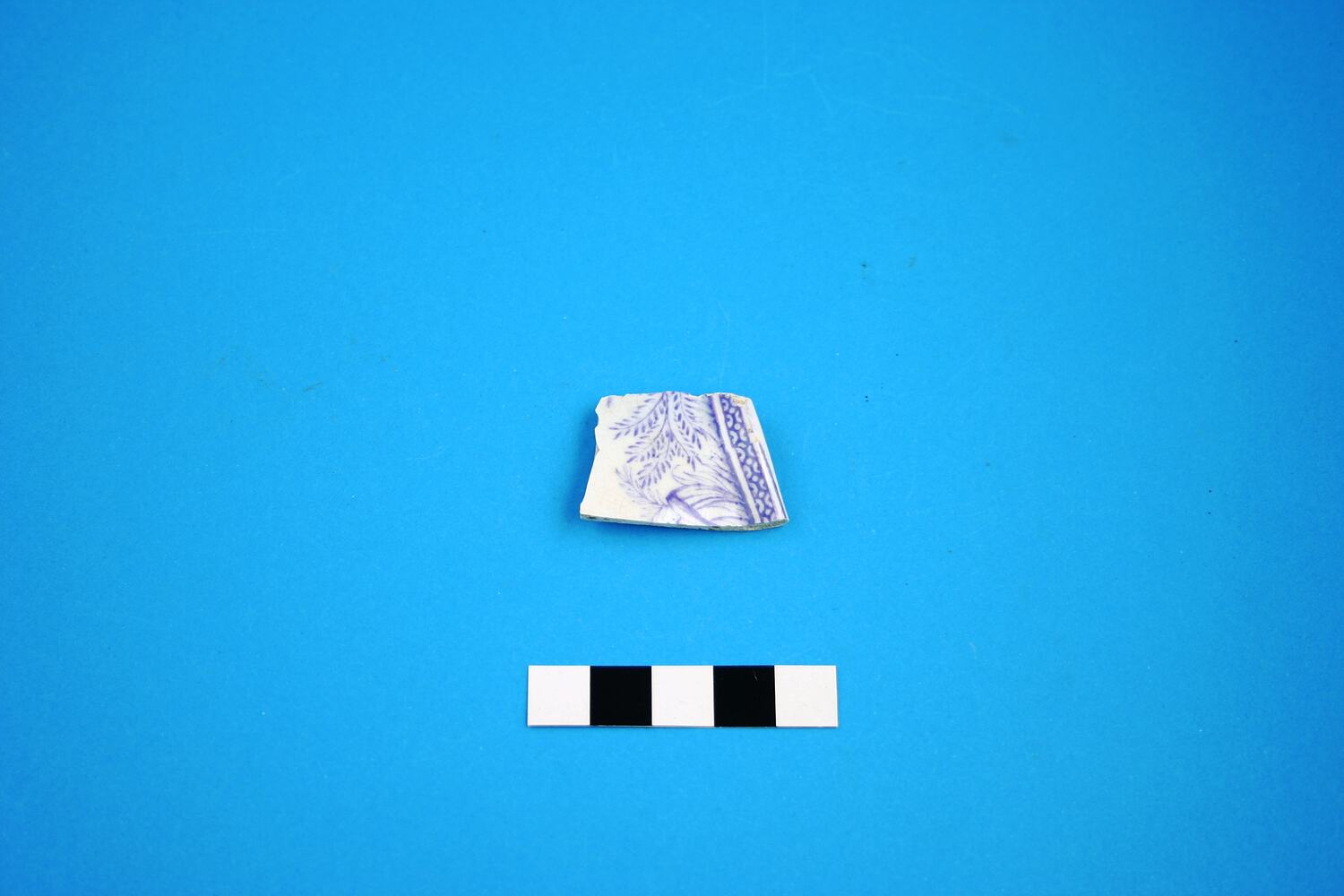 One earthenware cup rim fragment. The decoration is a violet transfer print in an unidentified floral pattern. Manufacture date is circa 1814 to circa mid-20th century.