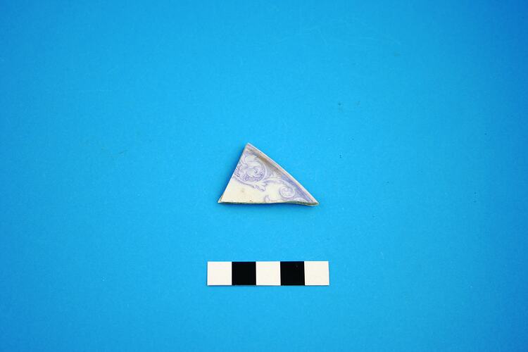 One earthenware plate rim fragment. The decoration is a violet transfer print in an unidentified pattern. Manufacture date is circa 1814 to circa mid-20th century.