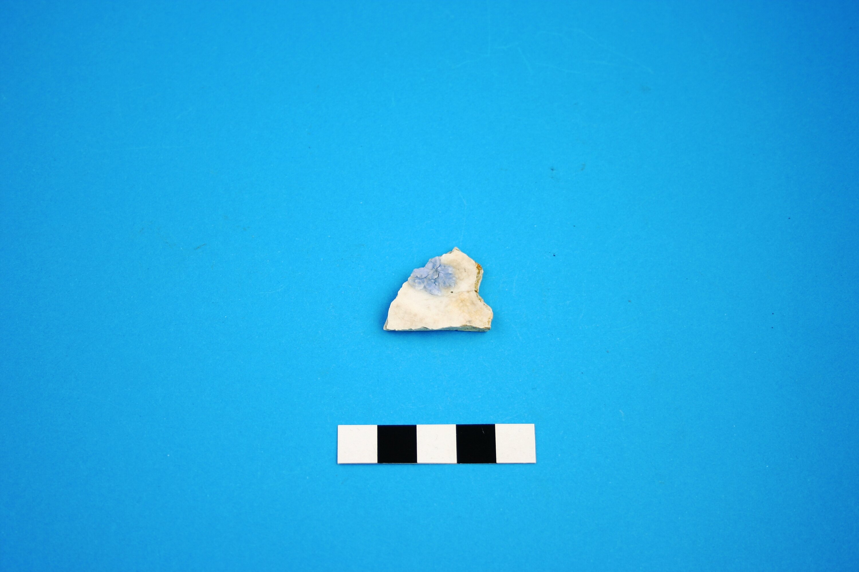 One fragment of a porcelain item, probably a small plate. The decoration is light blue applied sprig in a grapevine pattern. The manufacture date range is circa 1820 to the late 19th century.