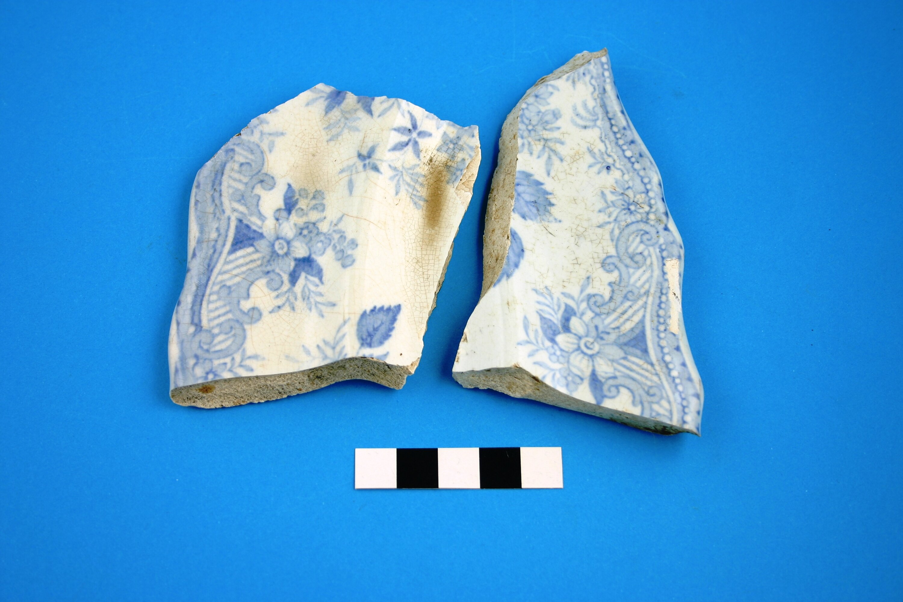 Two earthenware platter rim fragments. Transfer print is blue 'Asiatic Pheasants', popular in the second half of the 19th century and into Edwardian times.